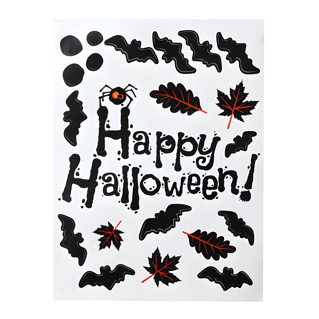 - Foglio decorativo con motivi neri di pipistrelli, foglie e il messaggio "Happy Halloween".