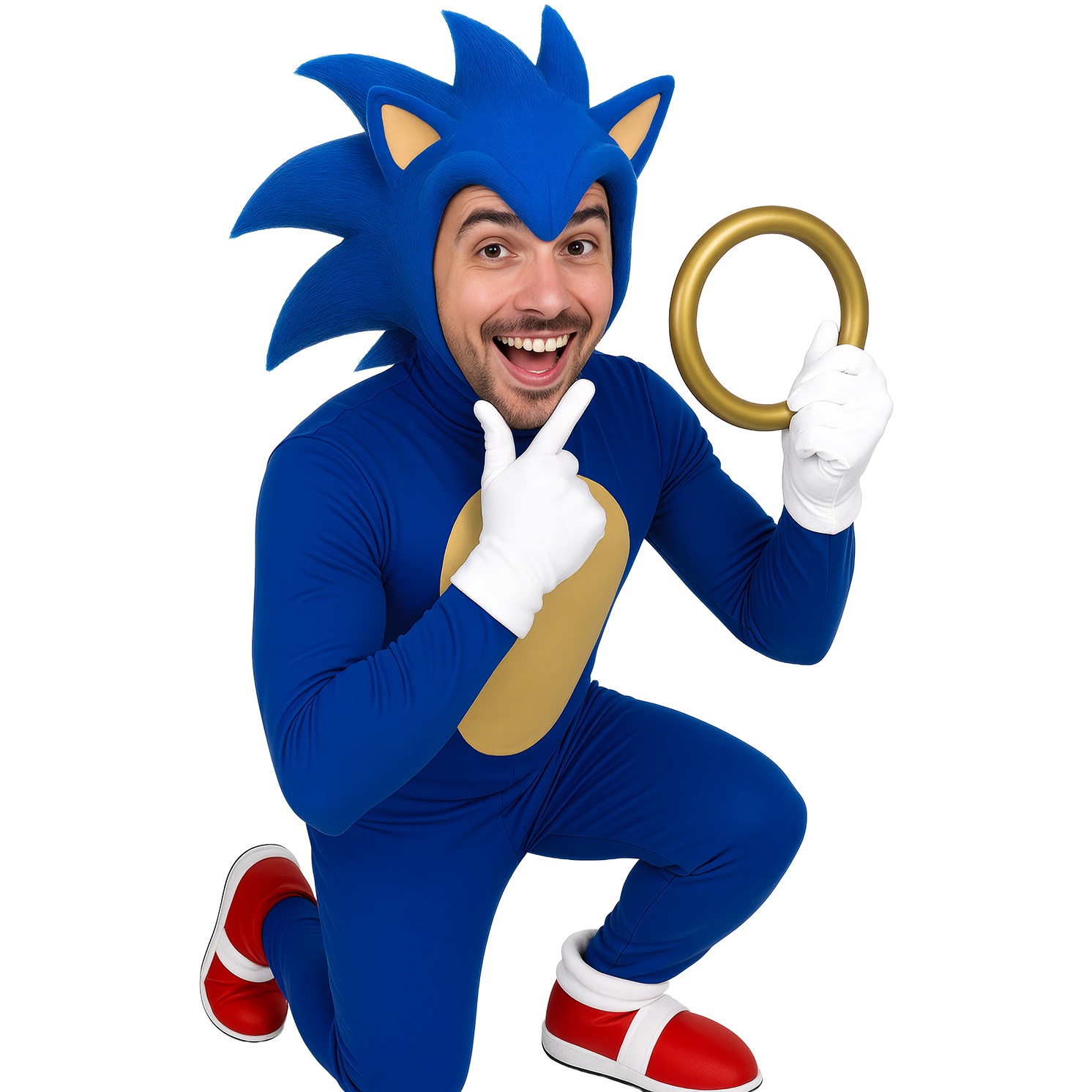 Set da 3 anelli dorati ispirati a Sonic, ideali come complemento per costumi, elemento per photocall o per giochi a tema.