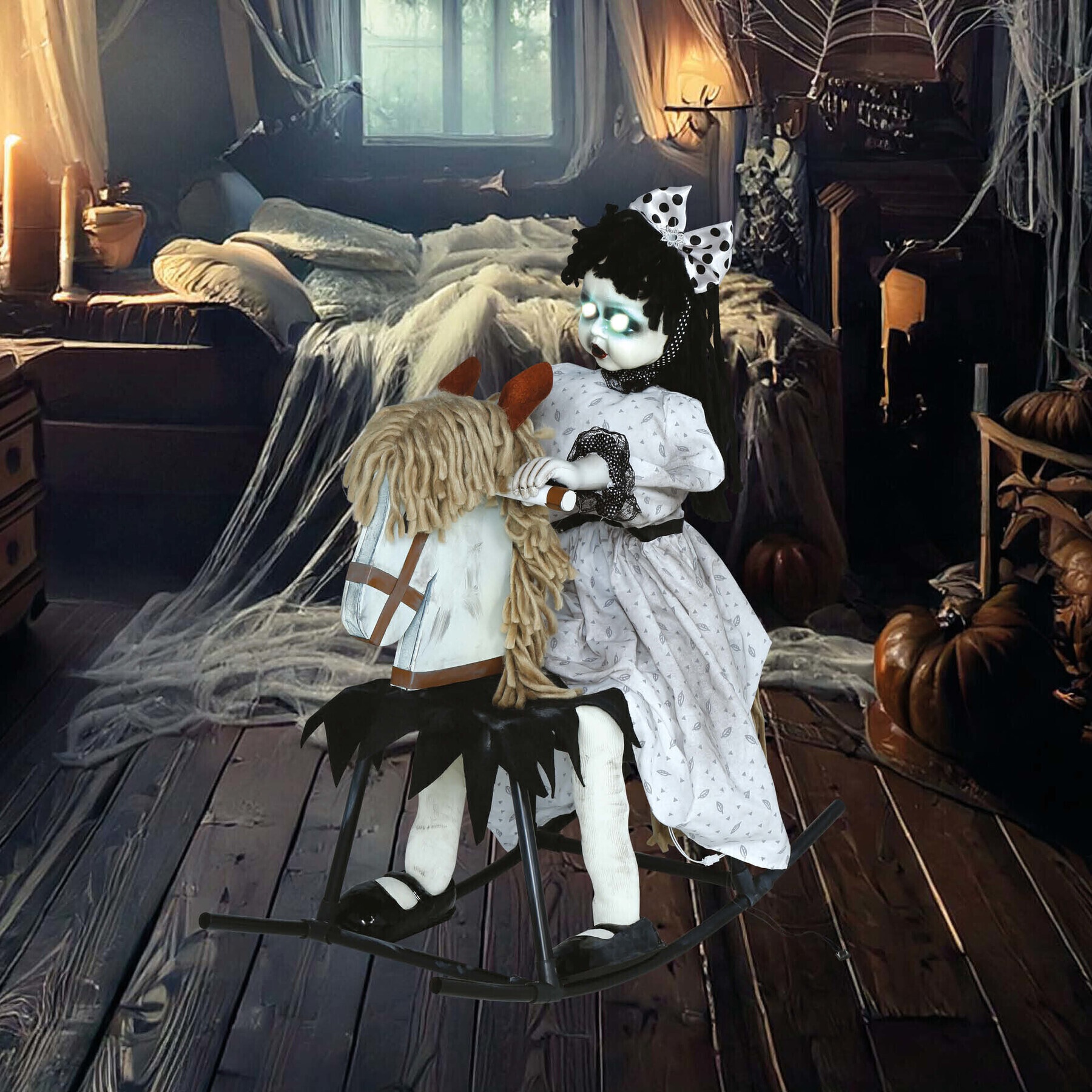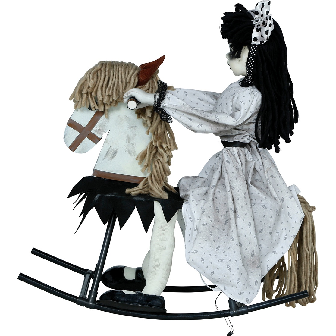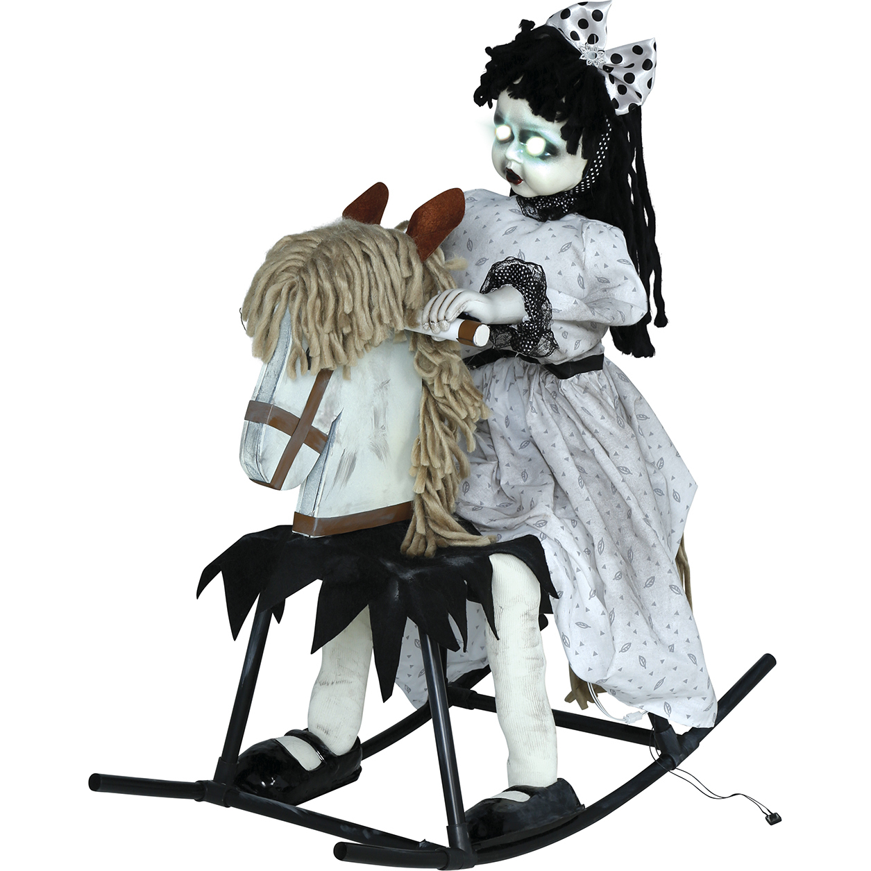 Bambola a cavallo dondolo con luce, suono e movimento di 70 cm