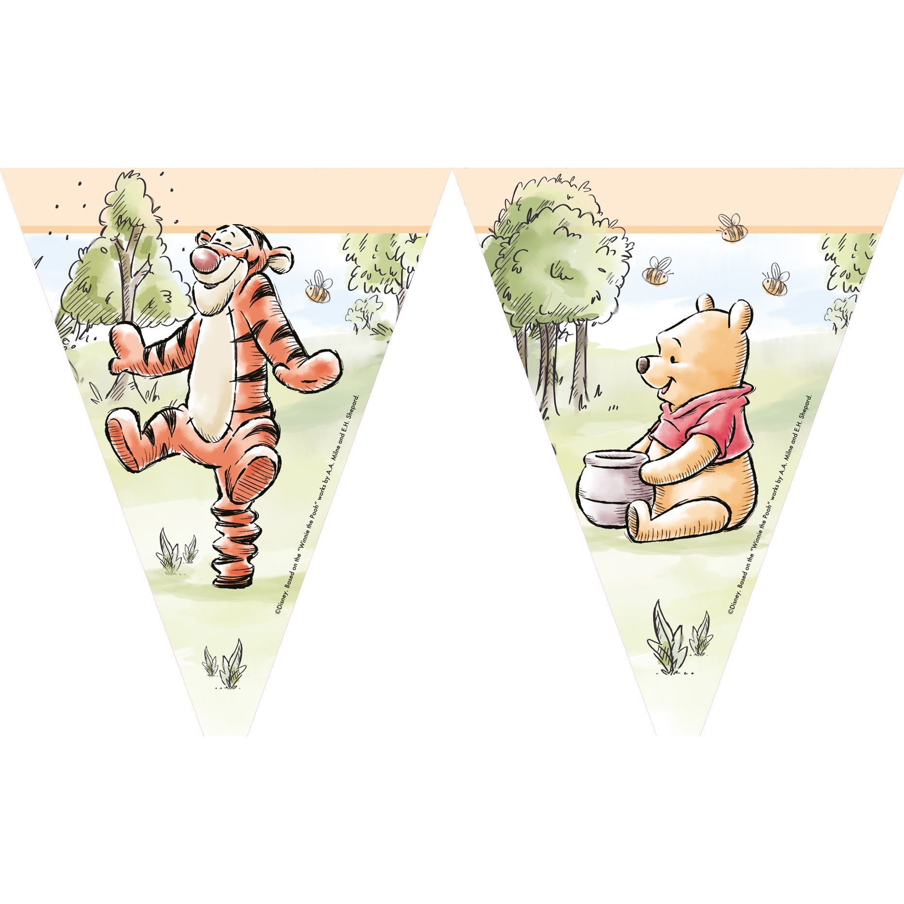 Banderina decorativa con illustrazioni di Winnie the Pooh e Tigro in stile natura, ideale per decorare feste di compleanno per bambini.