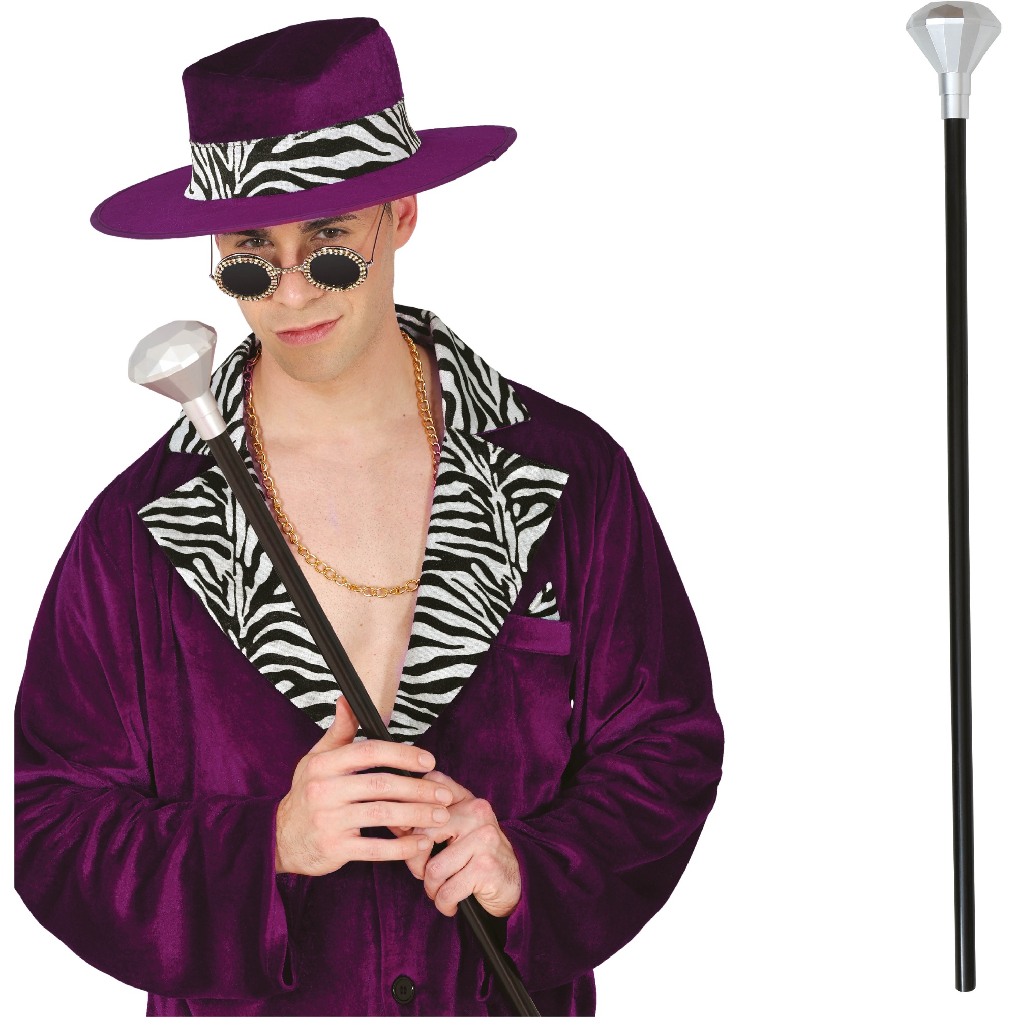 Accessorio d'impatto ispirato allo stile Willy Wonka, pensato per completare il tuo costume con un tocco di glamour. Realizzato in PVC leggero e dotato di un pomello effetto diamante argentato che cattura l'attenzione. Design elegante e maneggevole che conferisce presenza e stile al tuo look.
