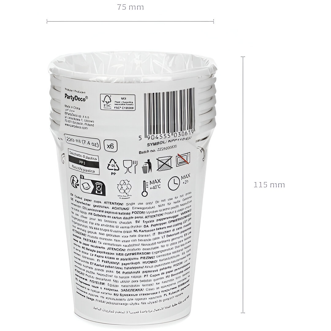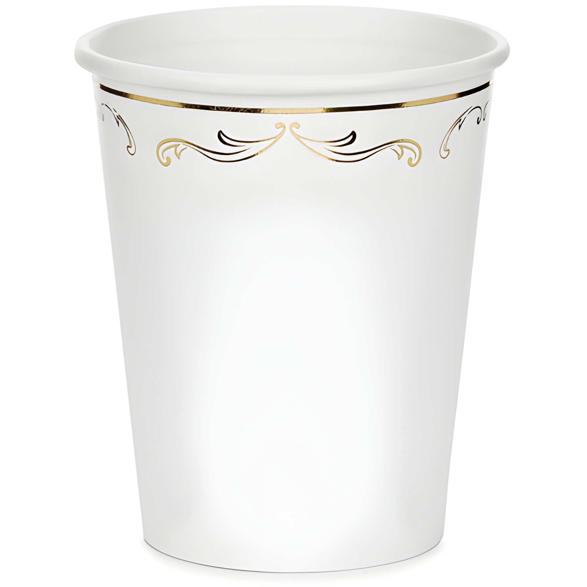 Bicchieri di carta bianchi con un delicato decoro dorato che dona un tocco sofisticato a qualsiasi celebrazione. Altezza ca. 9 cm e capacità ca. 220 ml (7,4 oz). Prodotto monouso, pensato per bevande fredde.