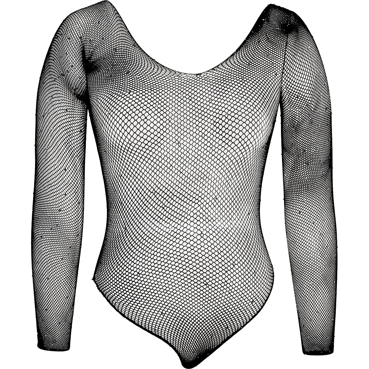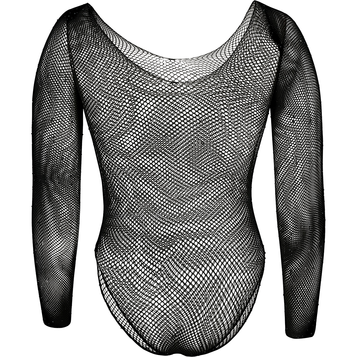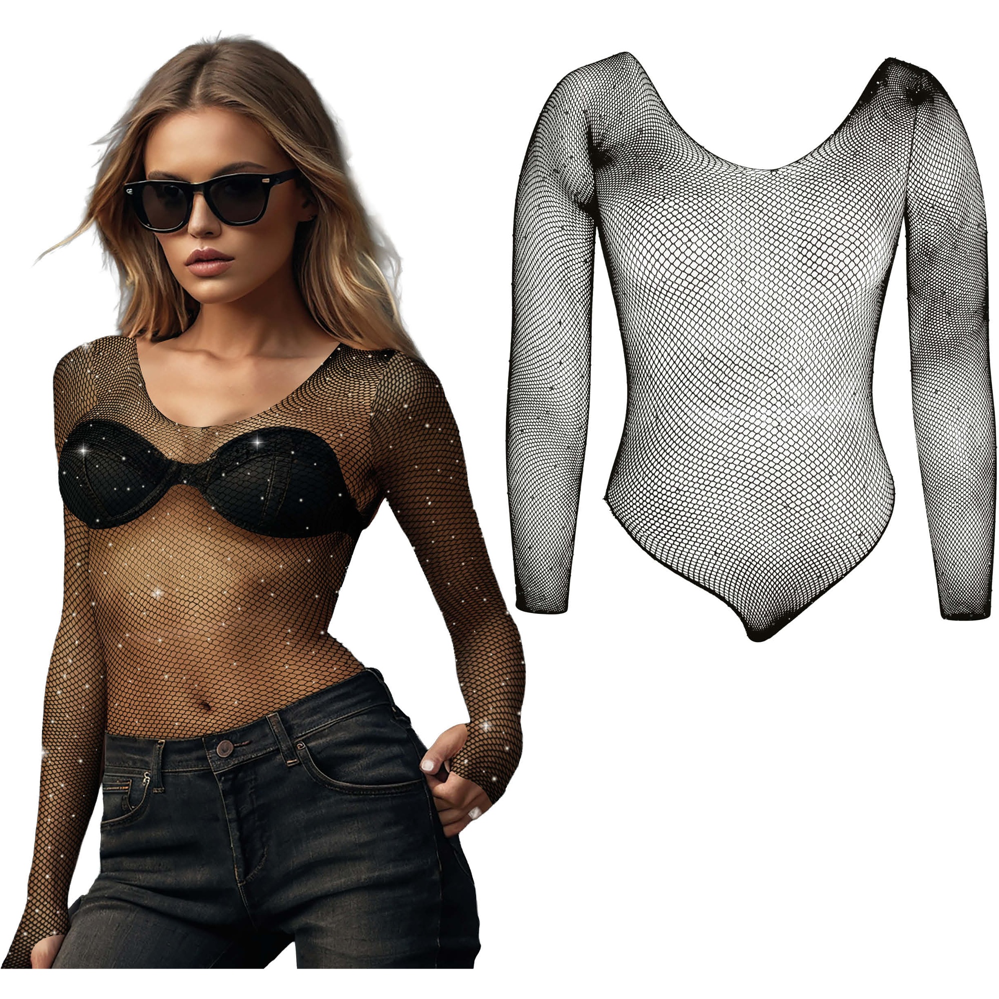 Body nero in rete con strass lucenti, pensato per i look da sera e l'ambiente club. Il taglio aderente e le maniche lunghe offrono una silhouette sofisticata e sensuale, con una trasparenza dosata che valorizza ogni outfit. Perfetto da indossare sopra una bralette o un top, con jeans, gonne o shorts per creare look audaci e contemporanei. Realizzato in elastan e poliammide per una vestibilità comoda e flessibile che si adatta al corpo.