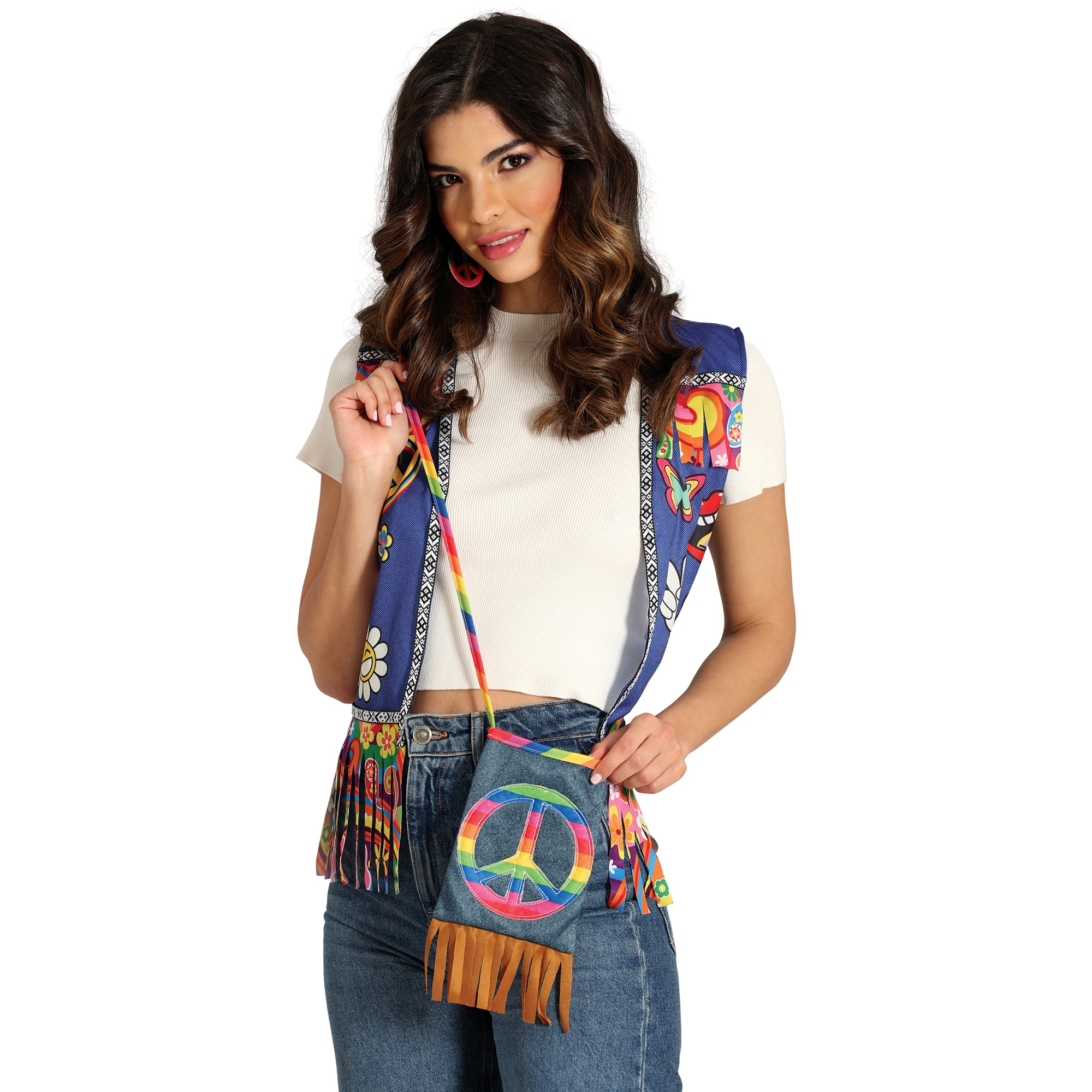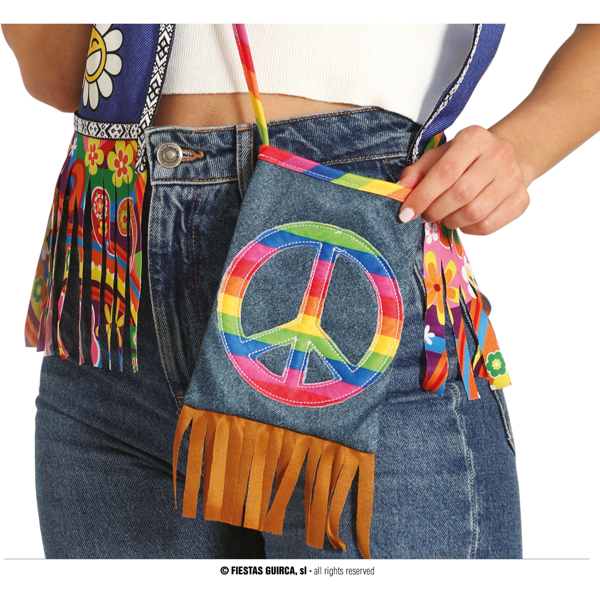 Accessorio ideale per look hippie e costumi. Borsa a tracolla dallo stile retrò con toppa del simbolo della pace dai colori vivaci e frange sul fondo. Realizzata in poliestere resistente e facile da pulire. Formato compatto 27 x 15 cm, perfetta per portare l'essenziale a feste, Carnevale o festival. La cinghia permette di indossarla sulla spalla o a bandoliera, aggiungendo comodità e un tocco boho a ogni outfit.