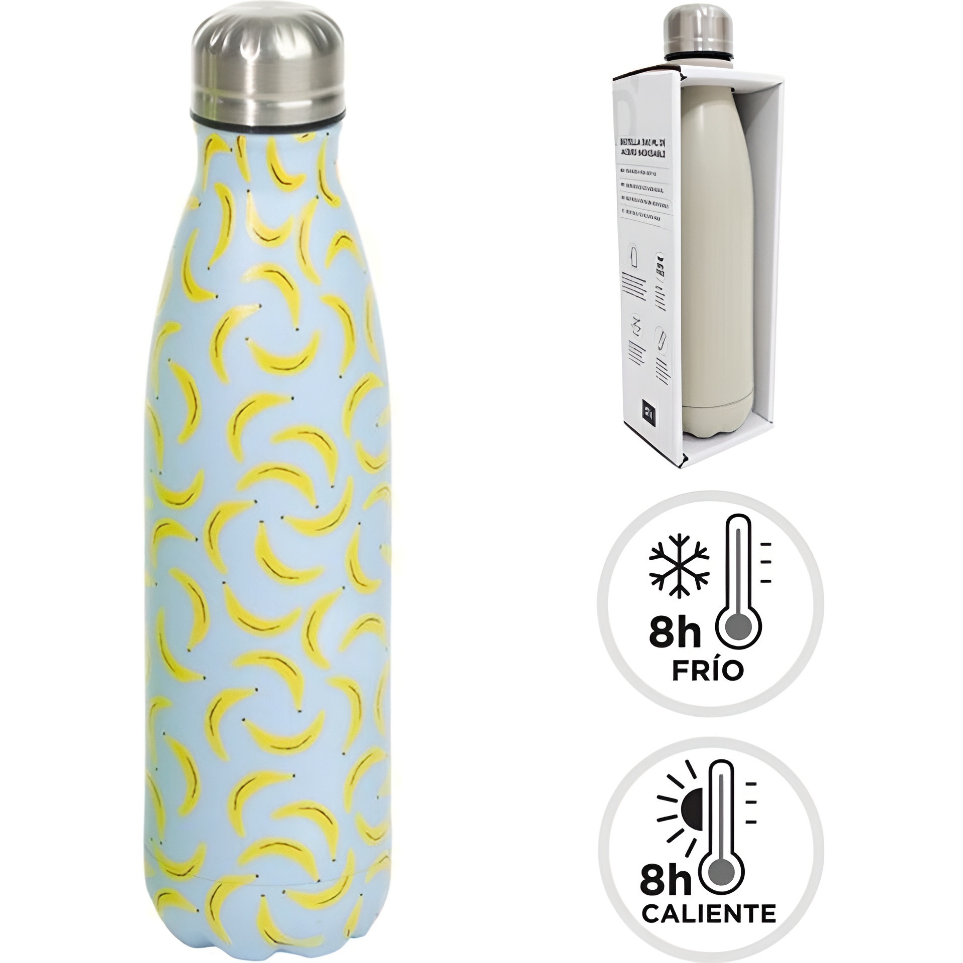 Bottiglia termica a doppio strato pensata per mantenere le tue bevande alla temperatura ideale più a lungo. La stampa di banane le conferisce un tocco allegro e estivo che si fa notare ovunque. Design ergonomico e chiusura sicura per evitare fuoriuscite e facilitare il trasporto. Perfetta per il quotidiano, il lavoro, lo sport o le gite all'aria aperta.