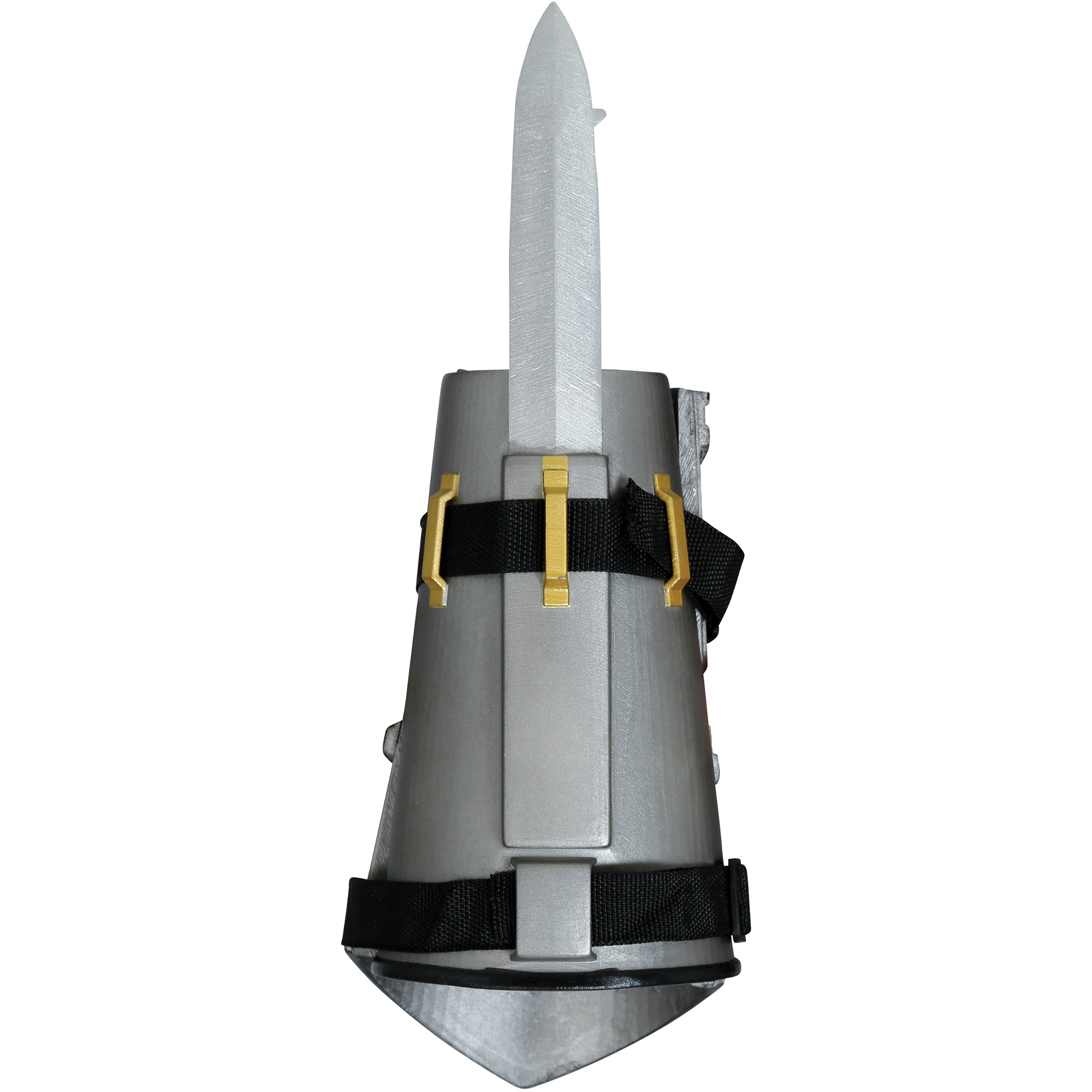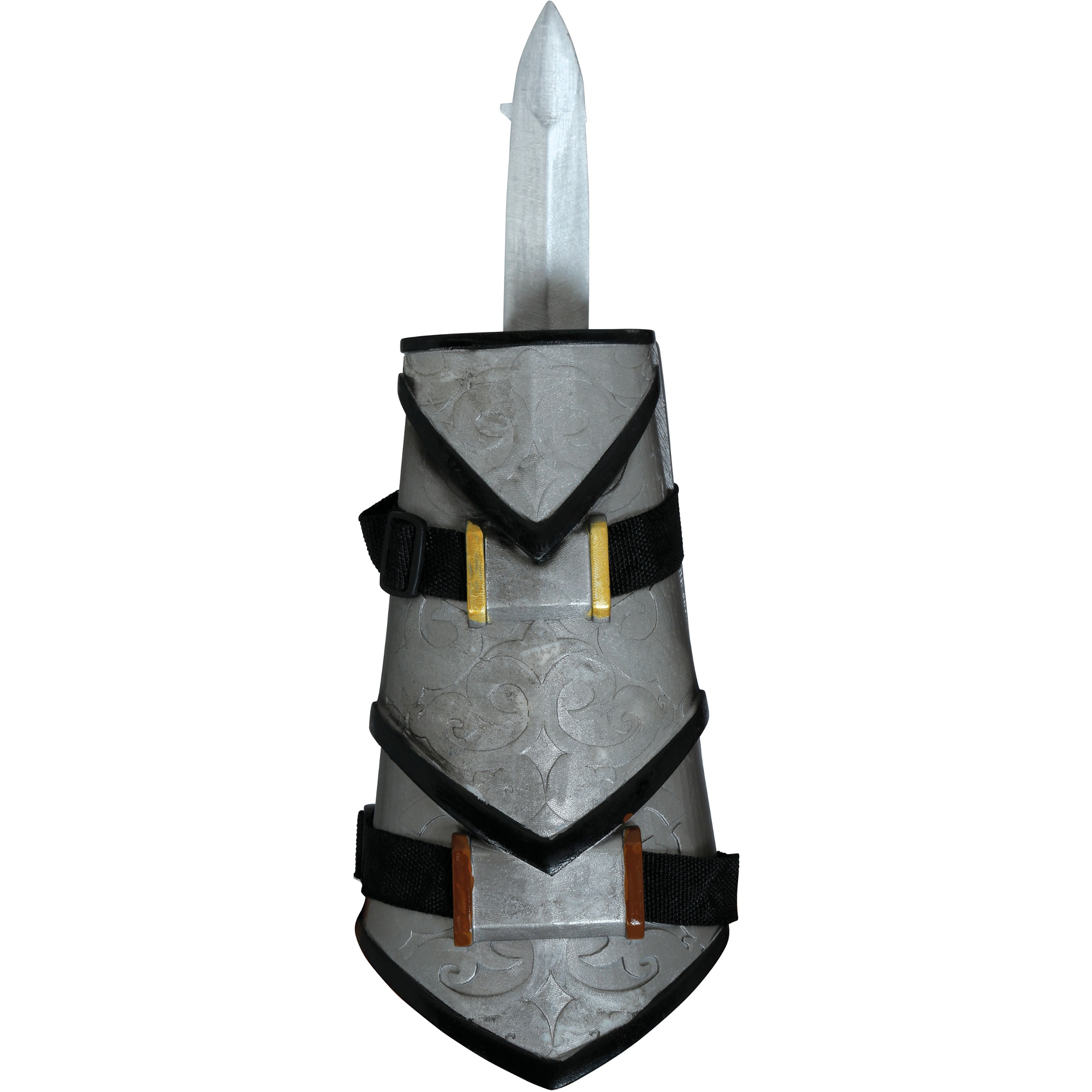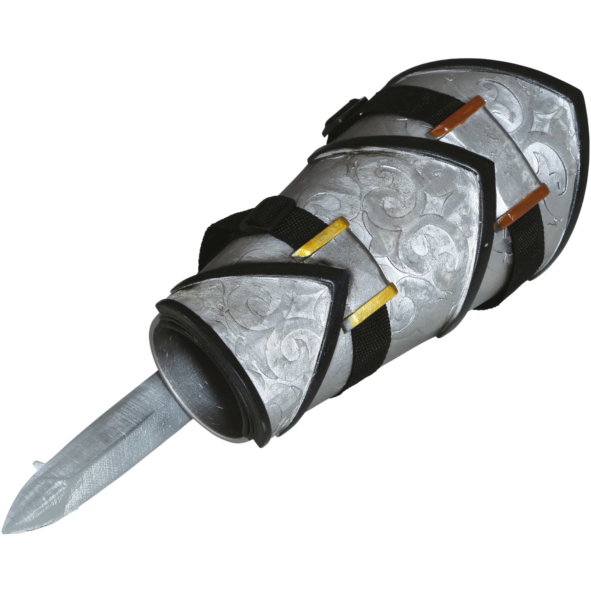 Bracciale con pugnale retrattile pensato per cosplay, rievocazioni e shooting fotografici. La finitura metallica invecchiata e i dettagli ornamentali conferiscono un aspetto realistico ma non pericoloso. Il meccanismo retrattile permette di estrarre il pugnale rapidamente per pose e scene, mentre le cinghie regolabili con velcro assicurano una calzata comoda e stabile sull'avambraccio.