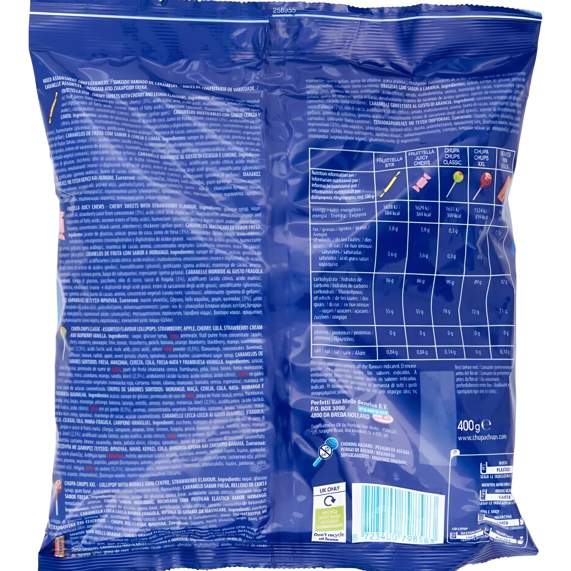 - Include: caramelle masticabili gusto ciliegia e limone (Fruittella Stix), caramelle masticabili gusto fragola (Fruittella Juicy Chews), lecca-lecca ai gusti assortiti (Chupa Chups Classic), lecca-lecca ripieni di chewing gum gusto fragola (Chupa Chups chicle), Mentos gusto arancia (Mentos Mini Rolls Orange).