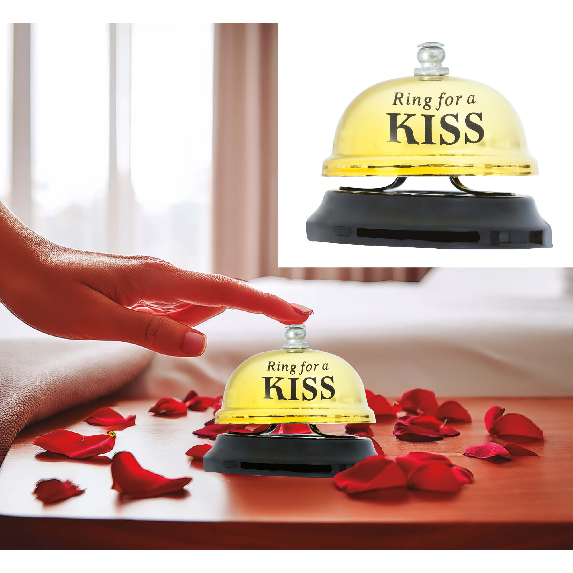 Piccola campanella da tavolo con il divertente messaggio "Ring for a KISS", pensata per creare momenti romantici e sorprese tra coppie. La sua campana metallica emette un suono chiaro e riconoscibile alla pressione, perfetto per attirare l'attenzione in modo affettuoso. È un'idea regalo originale per anniversari, fughe romantiche o cene intime. Facile da usare e dal design accattivante che decora qualsiasi comodino o vassoio.