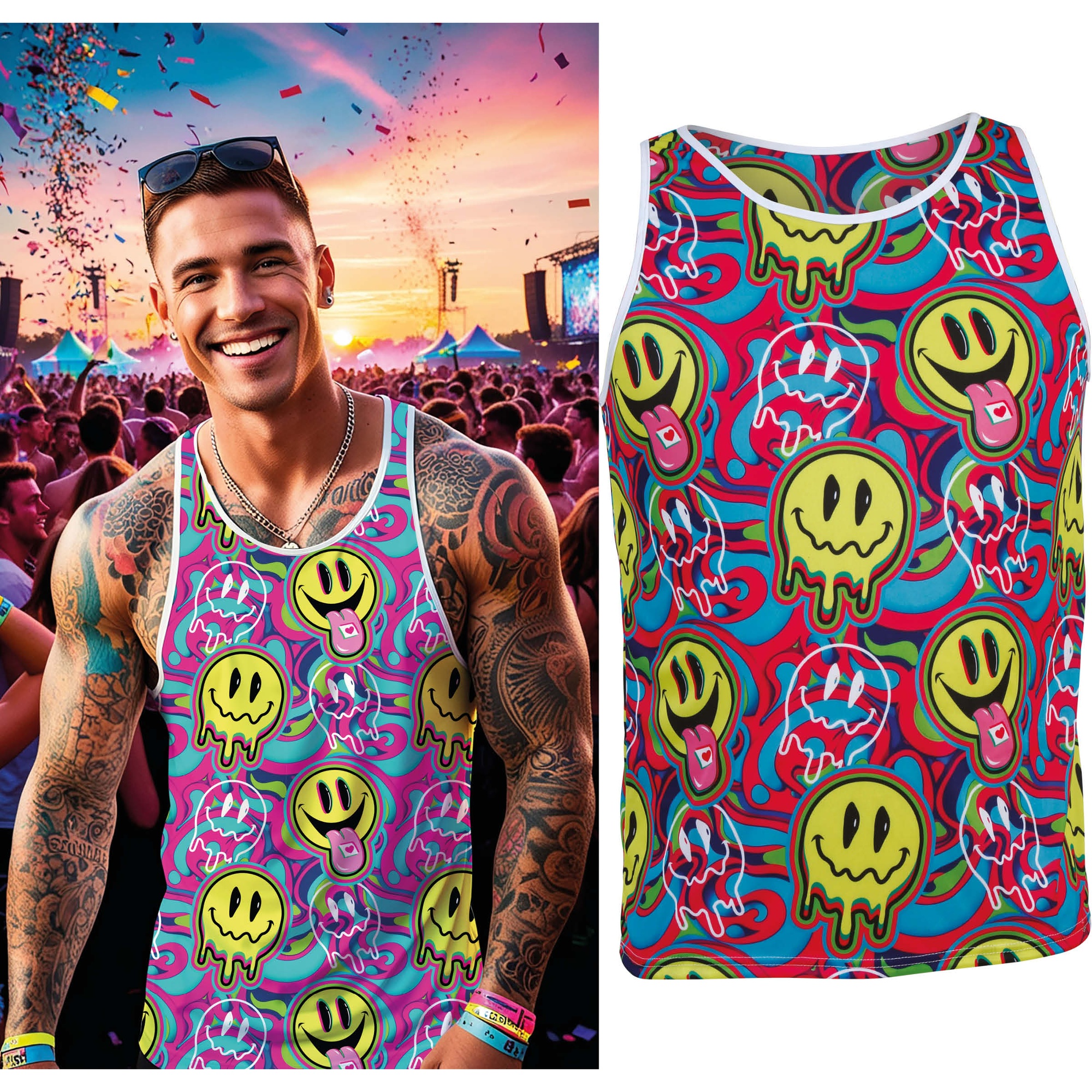 Canotta senza maniche con una stampa psichedelica e colori neon che catturano l'attenzione. Il motivo Acid Smiley ricopre l'intero capo per un look audace e contemporaneo. Il taglio assicura libertà di movimento, ideale per serate danzanti e festival di musica elettronica. Il tessuto in poliestere leggero preserva la vivacità dei colori e la forma della canotta. Un capo pensato per chi cerca uno stile vivace e distintivo.