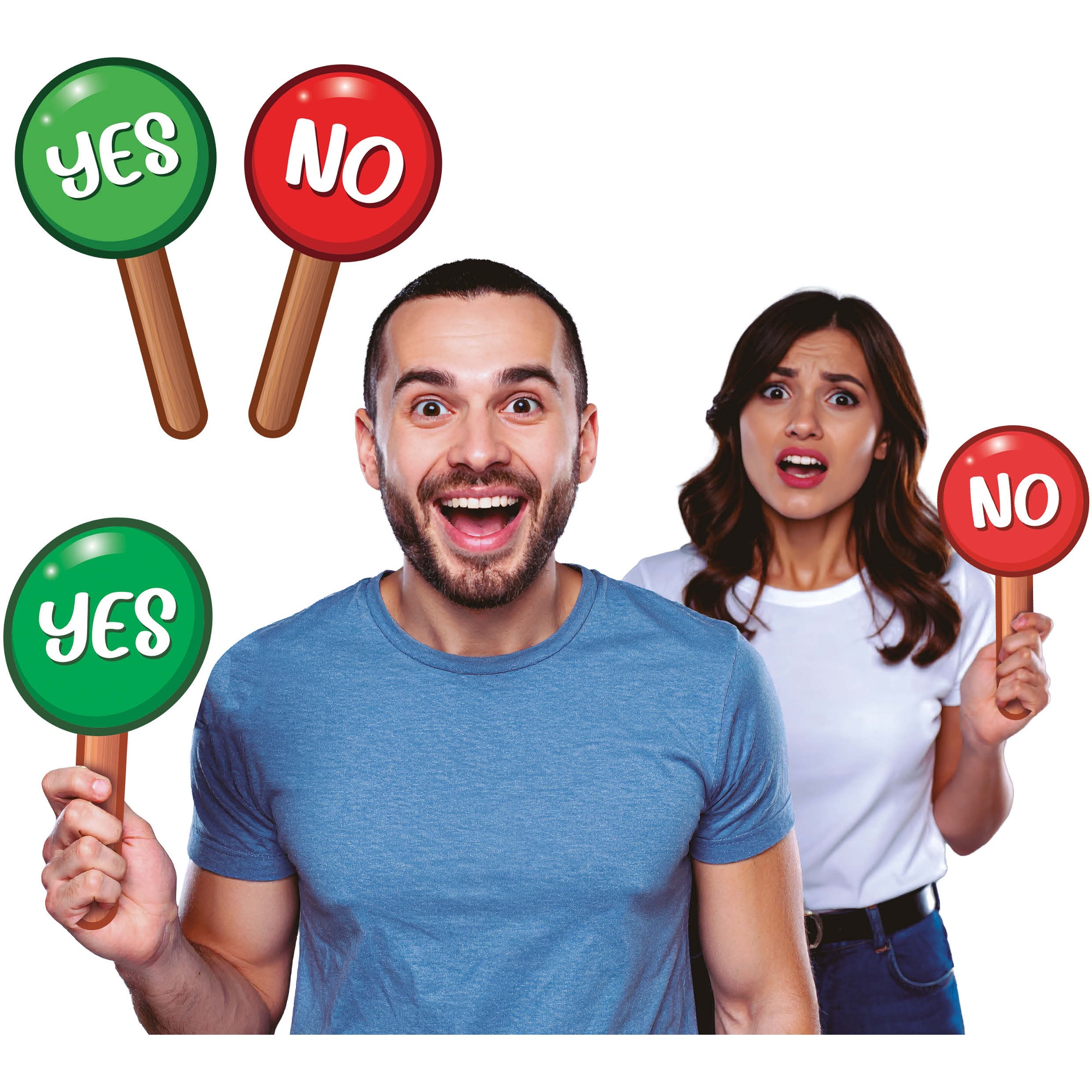 Cartelli a mano "Yes" e "No", pensati per dare un tocco divertente ed espressivo a foto e dinamiche durante gli eventi. Stampati su carta con colori vivaci e tipografia nitida per la massima leggibilità. Formato pratico di 13 x 25 cm, leggeri e comodi da impugnare. Il design permette risposte rapide e conferisce energia a photobooth, matrimoni, compleanni e riunioni.