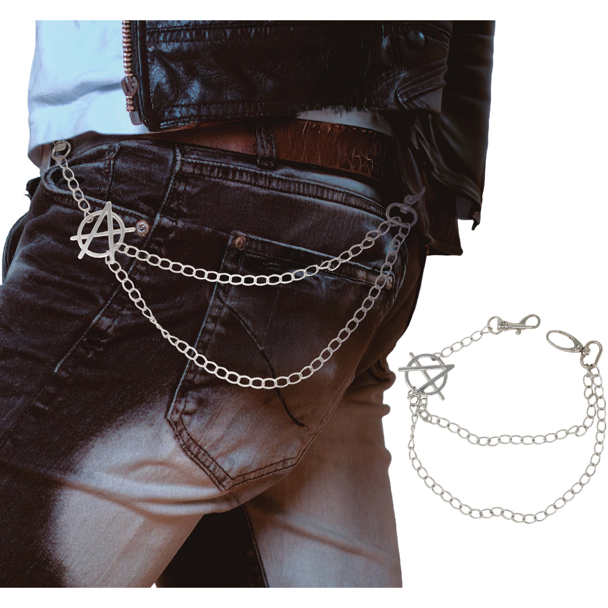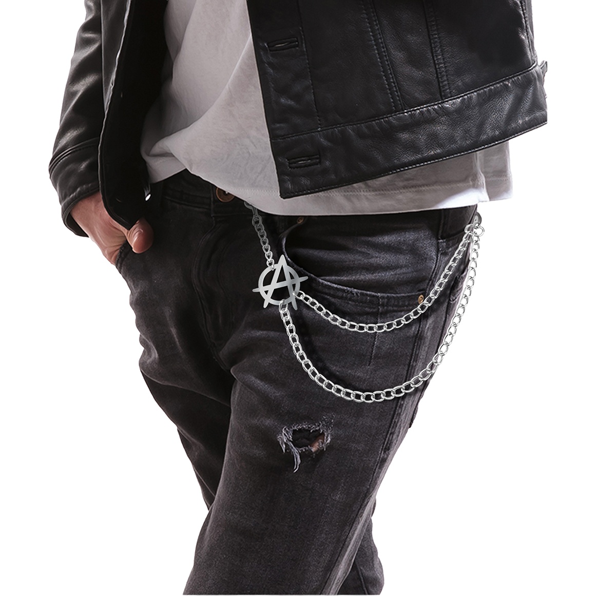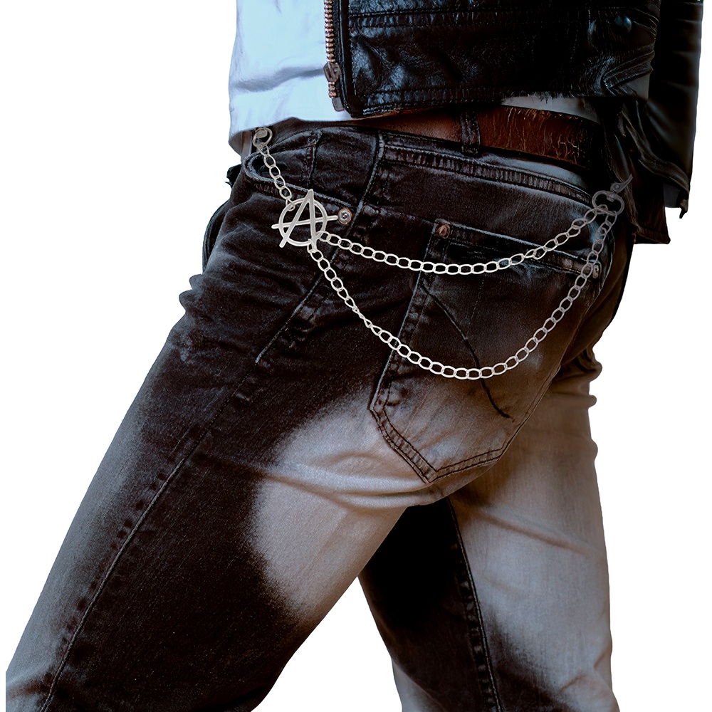Accessorio in stile punk pensato per aggiungere un tocco ribelle ai tuoi outfit con jeans. Il pendente con il simbolo dell'anarchia abbinato alla doppia catena crea un effetto d'impatto e autentico, ideale per concerti, serate fuori o per completare un look urbano con personalità. Progettata per fissarsi facilmente alla cintura o alle passanti del pantalone.