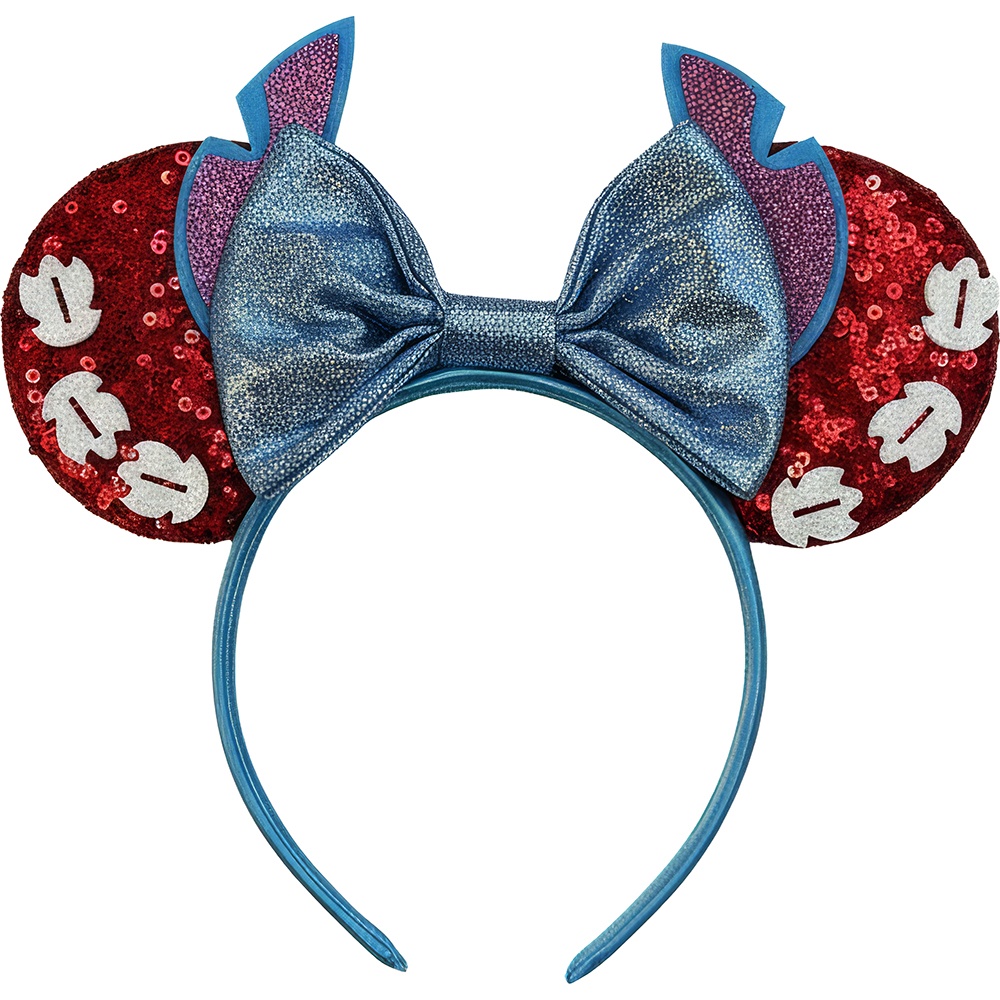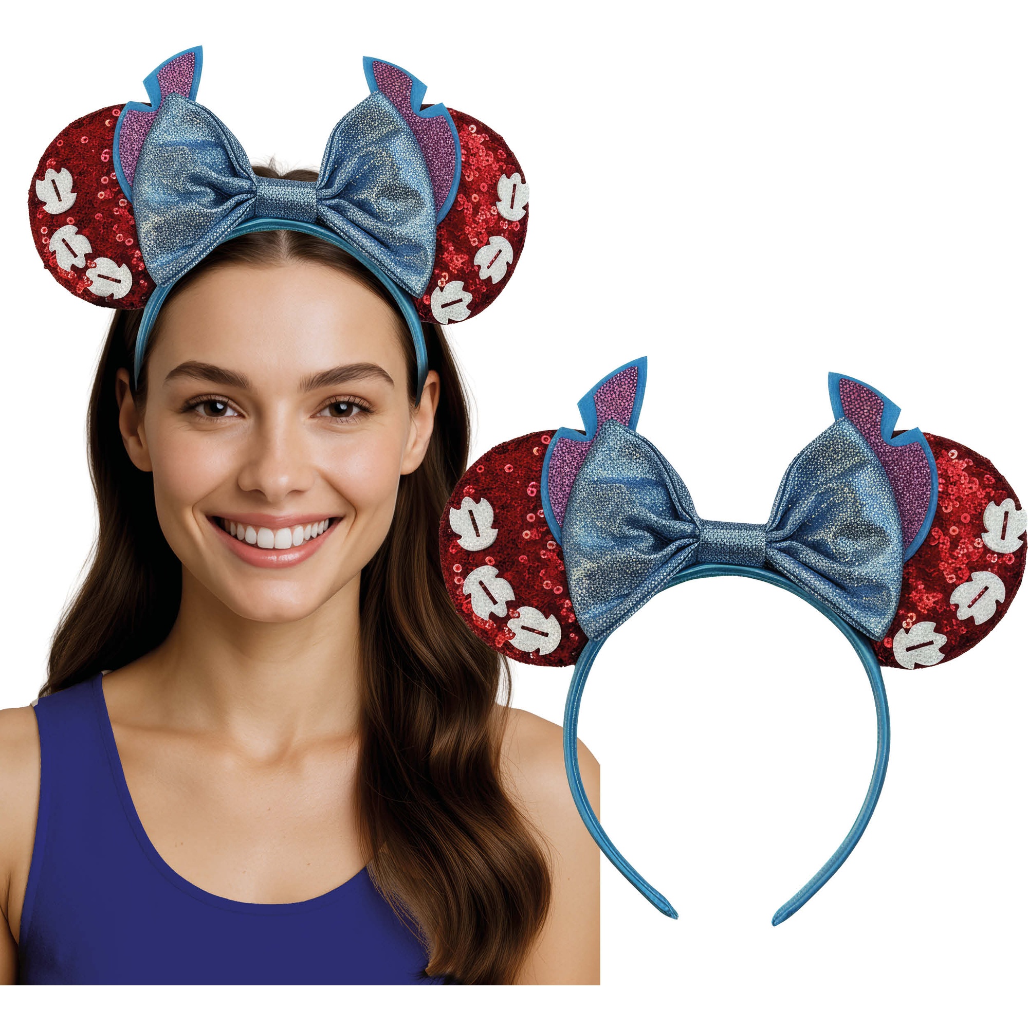 Cerchietto blu con orecchie tonde e un grande fiocco luccicante, ispirato a Minnie.