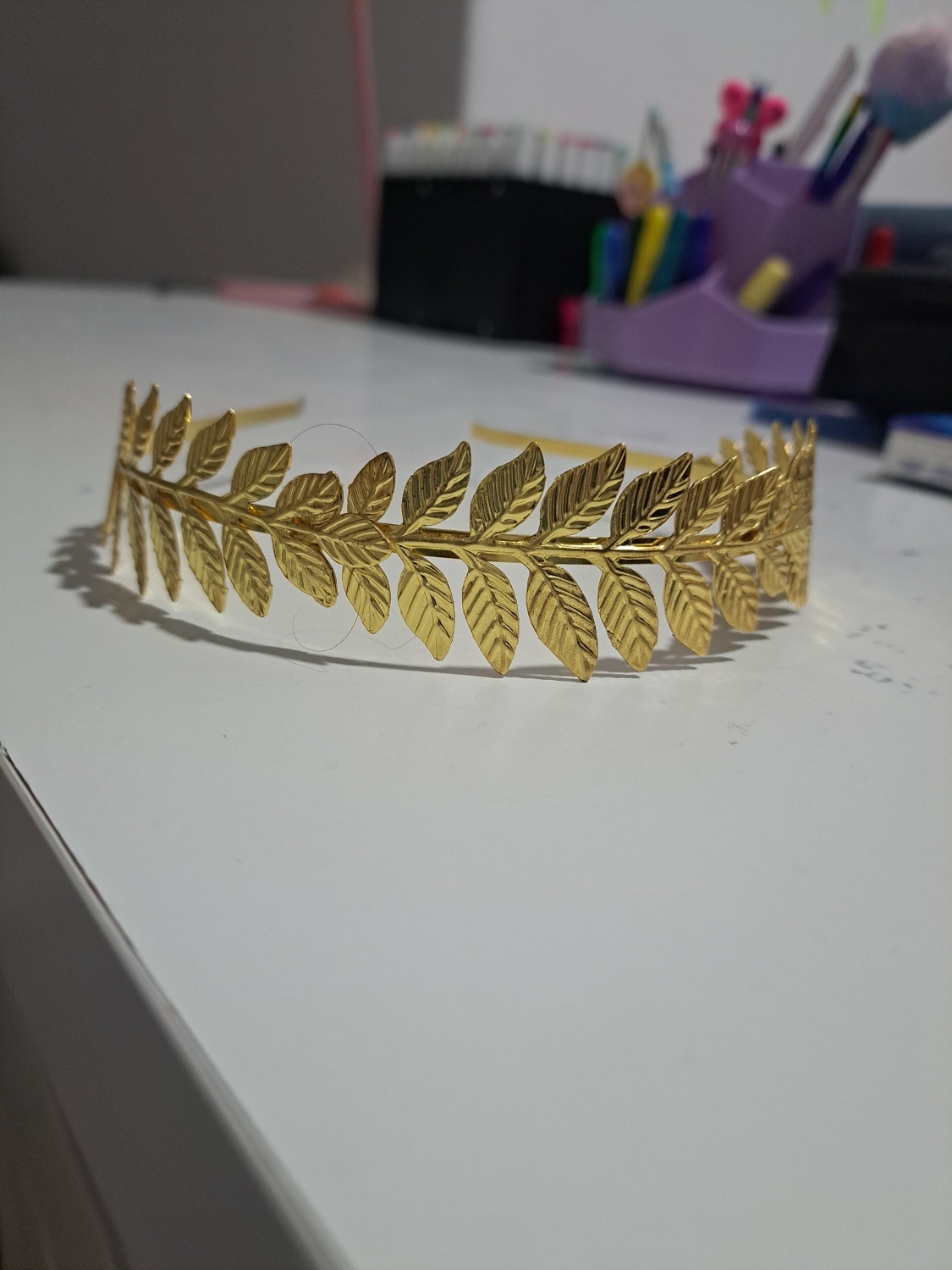 Questa è una corona a forma di diadema metallica dorata con foglie di alloro su tutta la parte anteriore.