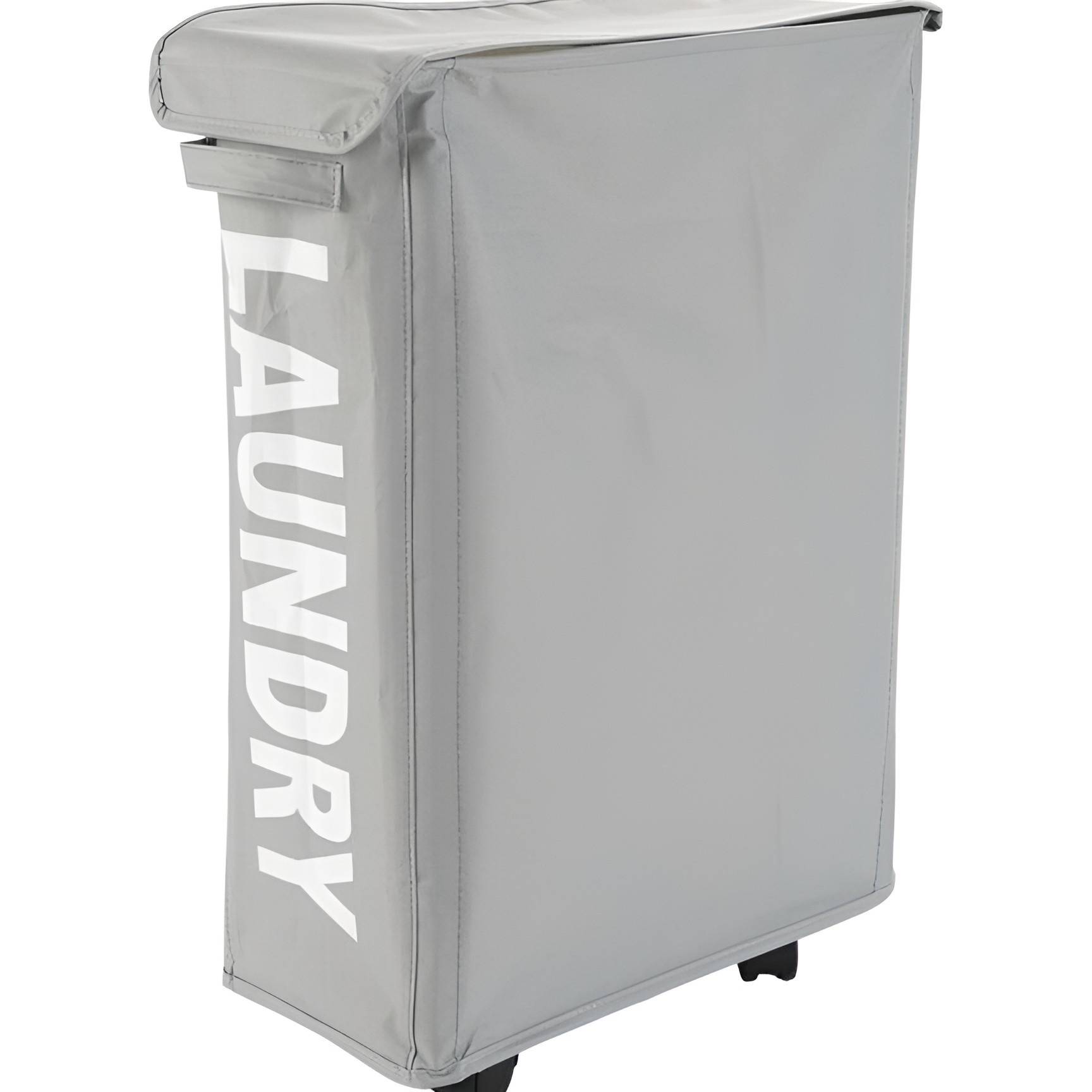 Design verticale con ruote integrate per uno spostamento agevole e coperchio che mantiene la biancheria nascosta.