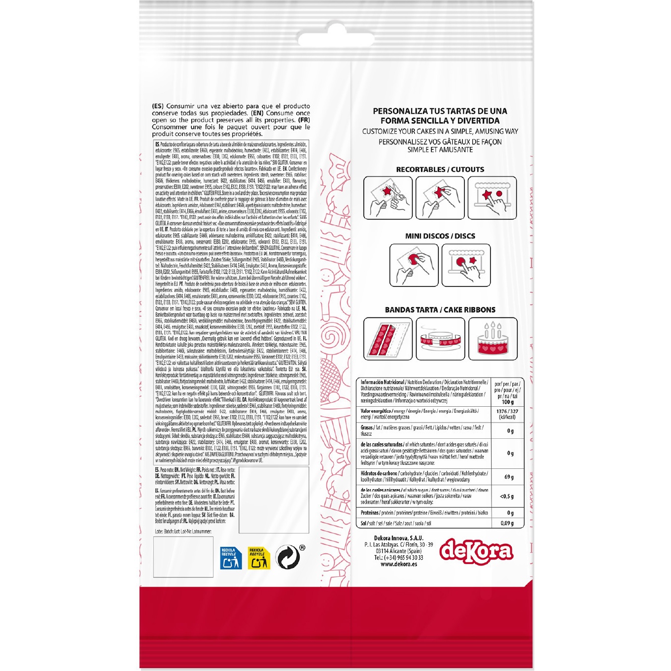 Ingredienti: amido, edulcorante: E965, stabilizzante: E406i, addensante: maltodestrina, umettante: E422, stabilizzanti: E414, E466, emulsionante: E433, aroma, conservanti: E330, E202, edulcorante: E955, coloranti: E102, E122, E133, E151. E102, E122 possono avere effetti negativi sull'attività e sull'attenzione dei bambini.