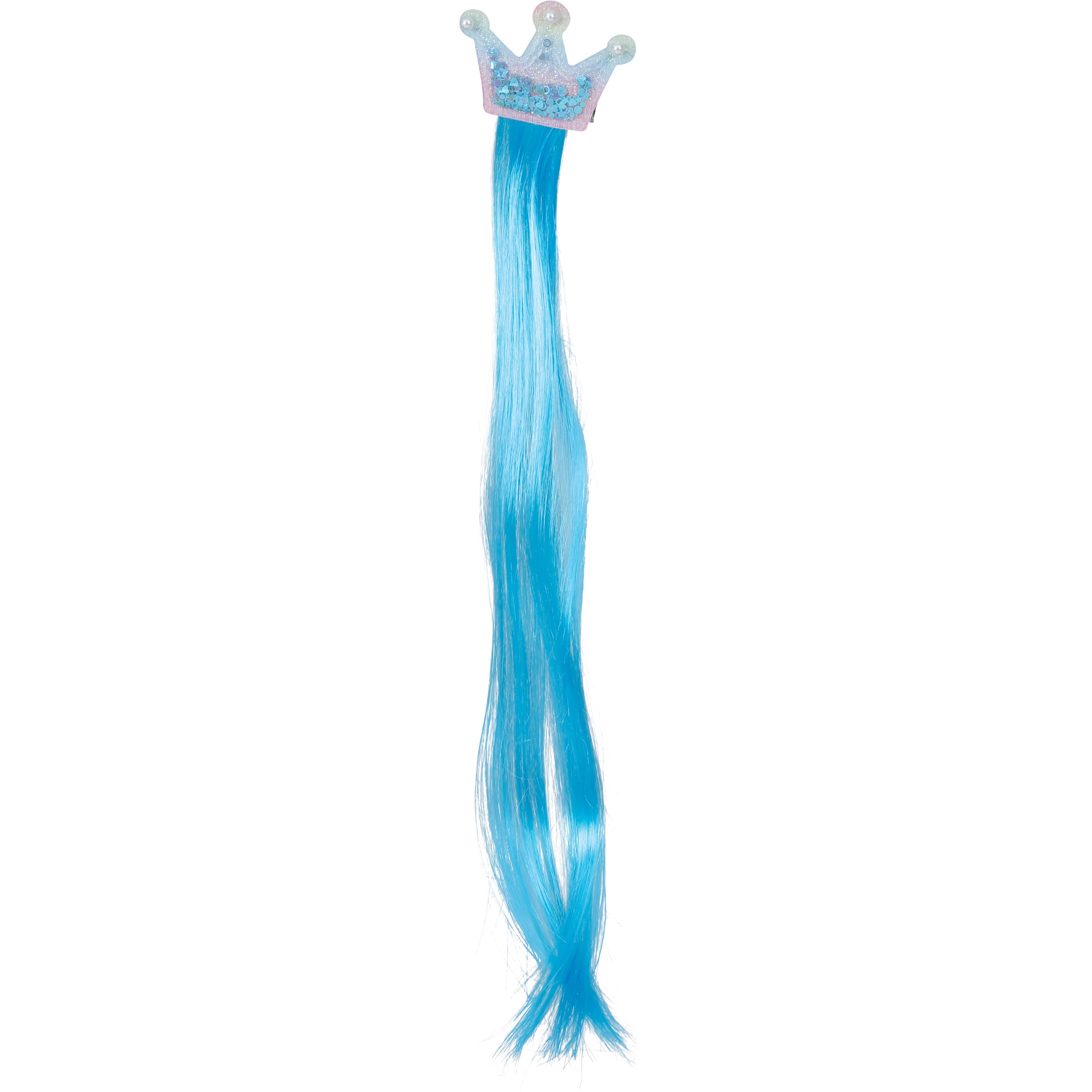 Ciuffo in PVC azzurro con clip a forma di corona che dona un tocco divertente e fiabesco all'acconciatura. Misura 35 cm e si applica in modo semplice e sicuro, senza bisogno di accessori aggiuntivi. Il suo colore e la brillantezza valorizzano ogni look per feste e celebrazioni. Leggero e comodo da indossare per tutta la durata dell'evento.