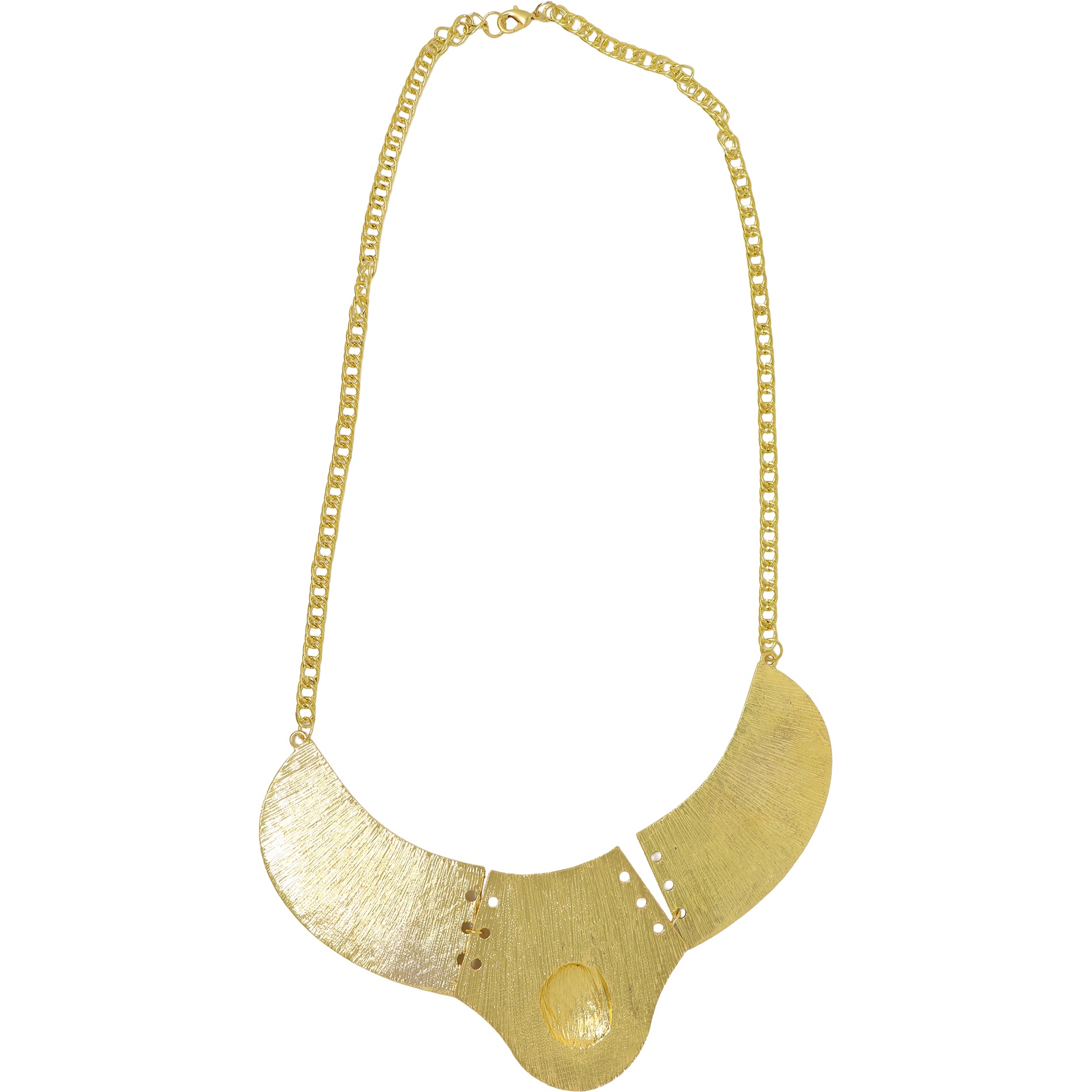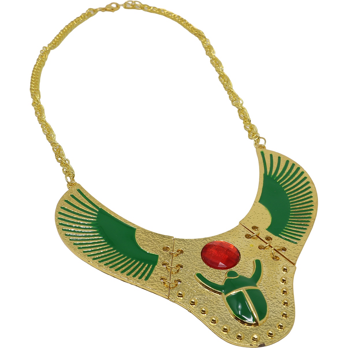 Collana in stile egizio ispirata alla figura di Cleopatra, con motivo alato, dettagli verdi e una gemma centrale rossa che dona un tocco di colore ed eleganza. Ideale per completare il look di una regina egizia a Carnevale, alle feste a tema, a teatro o in servizi fotografici; garantisce un impatto visivo immediato e valorizza qualsiasi outfit ispirato all'antico Egitto.
