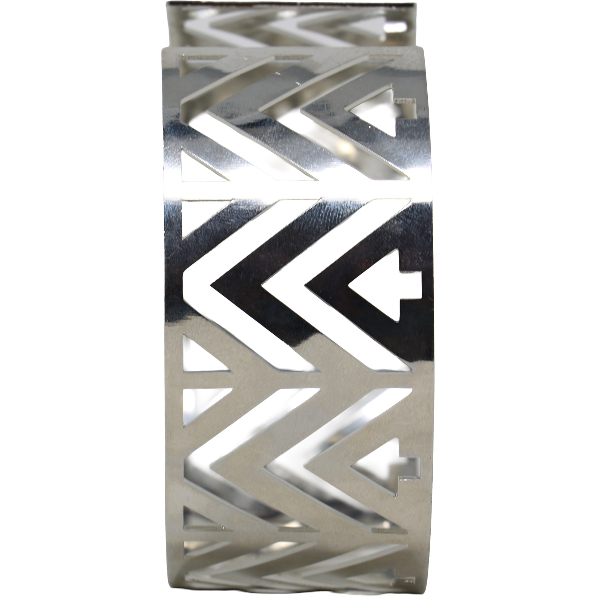 - Design rigido e geometrico con finitura metallica riflettente per un look futurista.