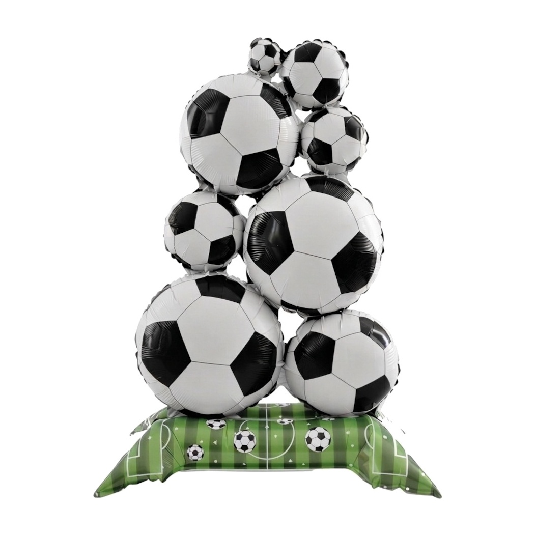 Decora il compleanno dei più piccoli con un grande pallone in foil che ricrea un gruppo di palloni su una base con motivo campo da calcio.