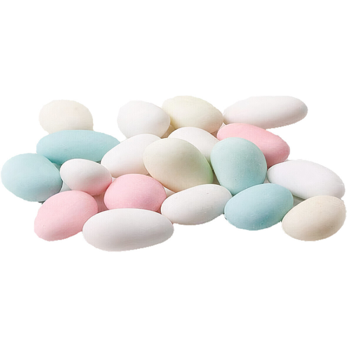 Ingredienti: copertura di zucchero (85%), (zucchero, farina di riso, sciroppo di glucosio, amido di riso, agente di rivestimento: gomma arabica, coloranti: E100, E120, E132) e mandorle (15%).