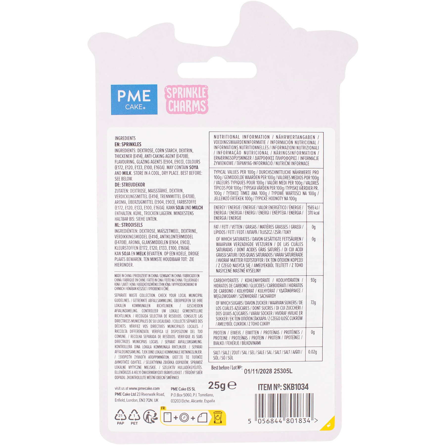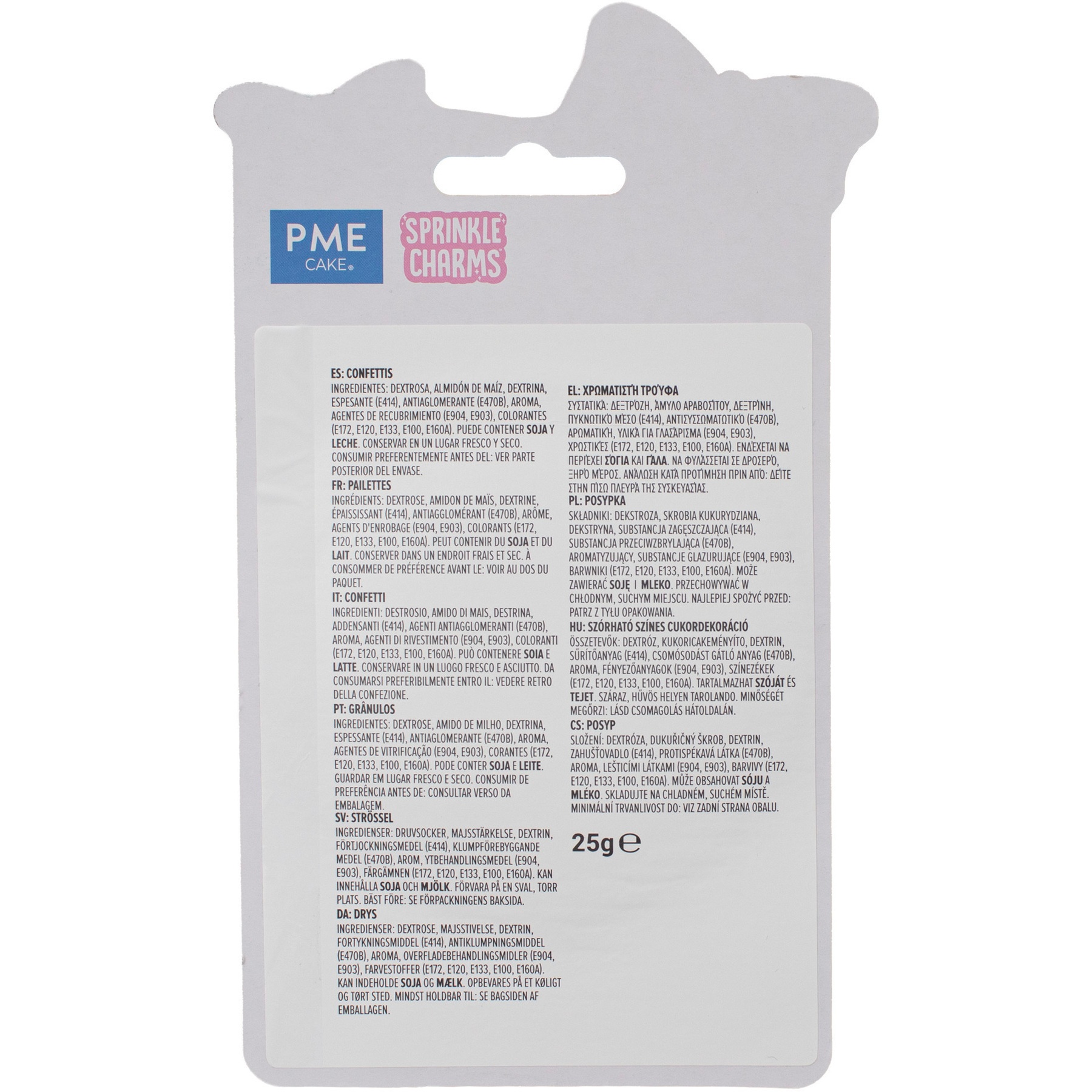 Ingredienti: destrosio, amido di mais, destrina, addensante (E414), antiagglomerante (E470b), aroma, agenti di rivestimento (E904, E903), coloranti (E172, E120, E133, E100, E160a).