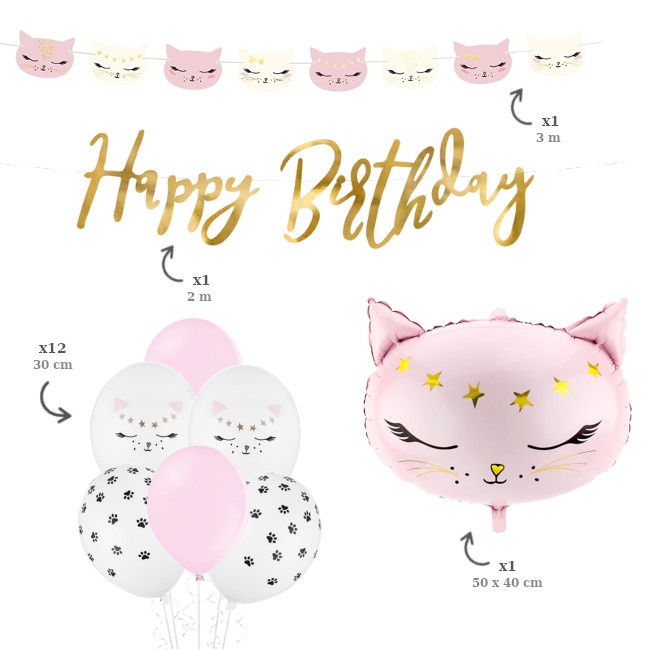 È un set con tutto il necessario per godere di una festa a tema di gatto rosa.