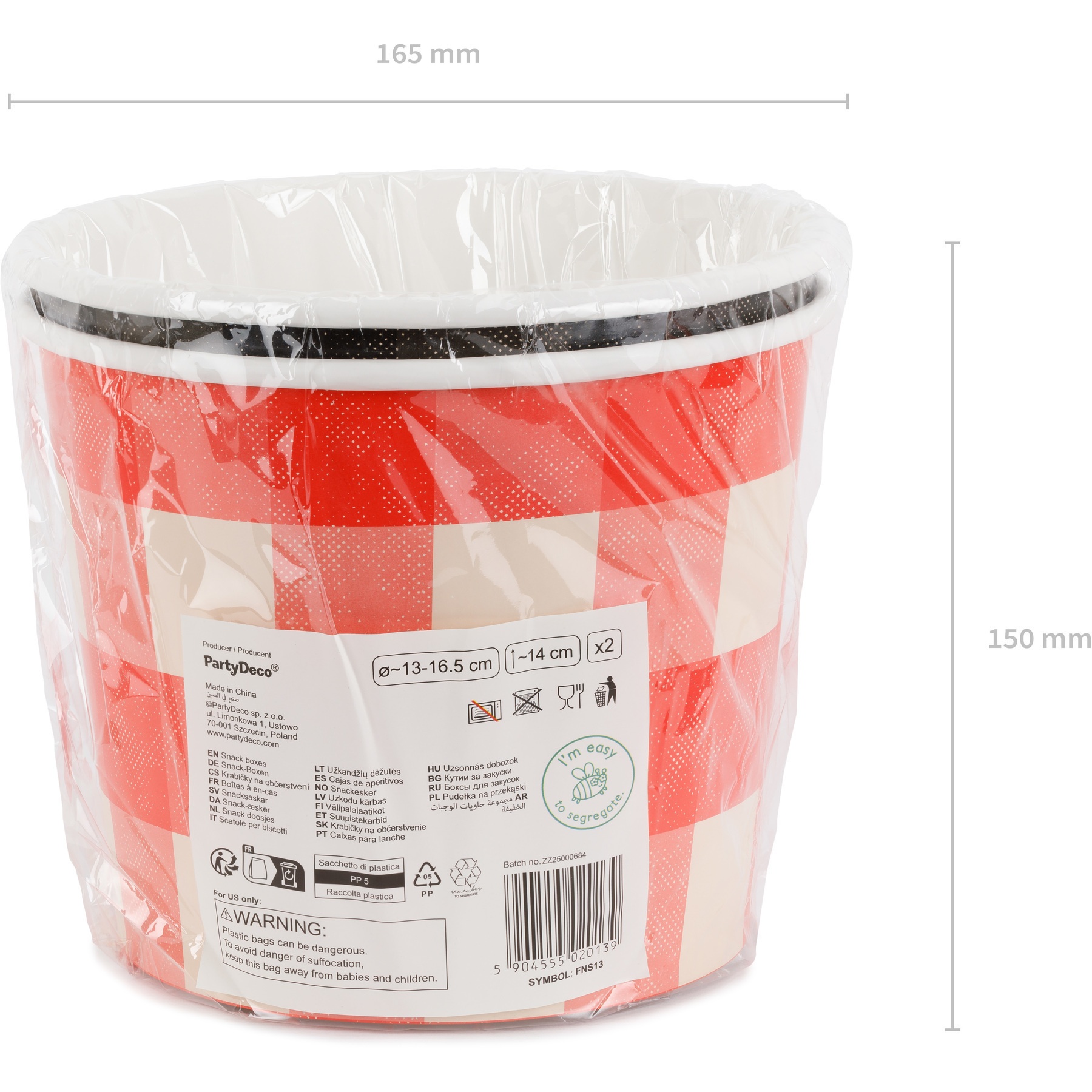 Solo para uso como envase/recipiente temporal de alimentos secos y fríos (por ejemplo palomitas y snacks); no es un alimento.