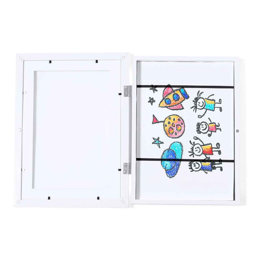 - Offre un vano per conservare disegni di formato A4 fermati da fasce elastiche, mentre sulla copertina incorpora una cornice per evidenziare il disegno scelto.
