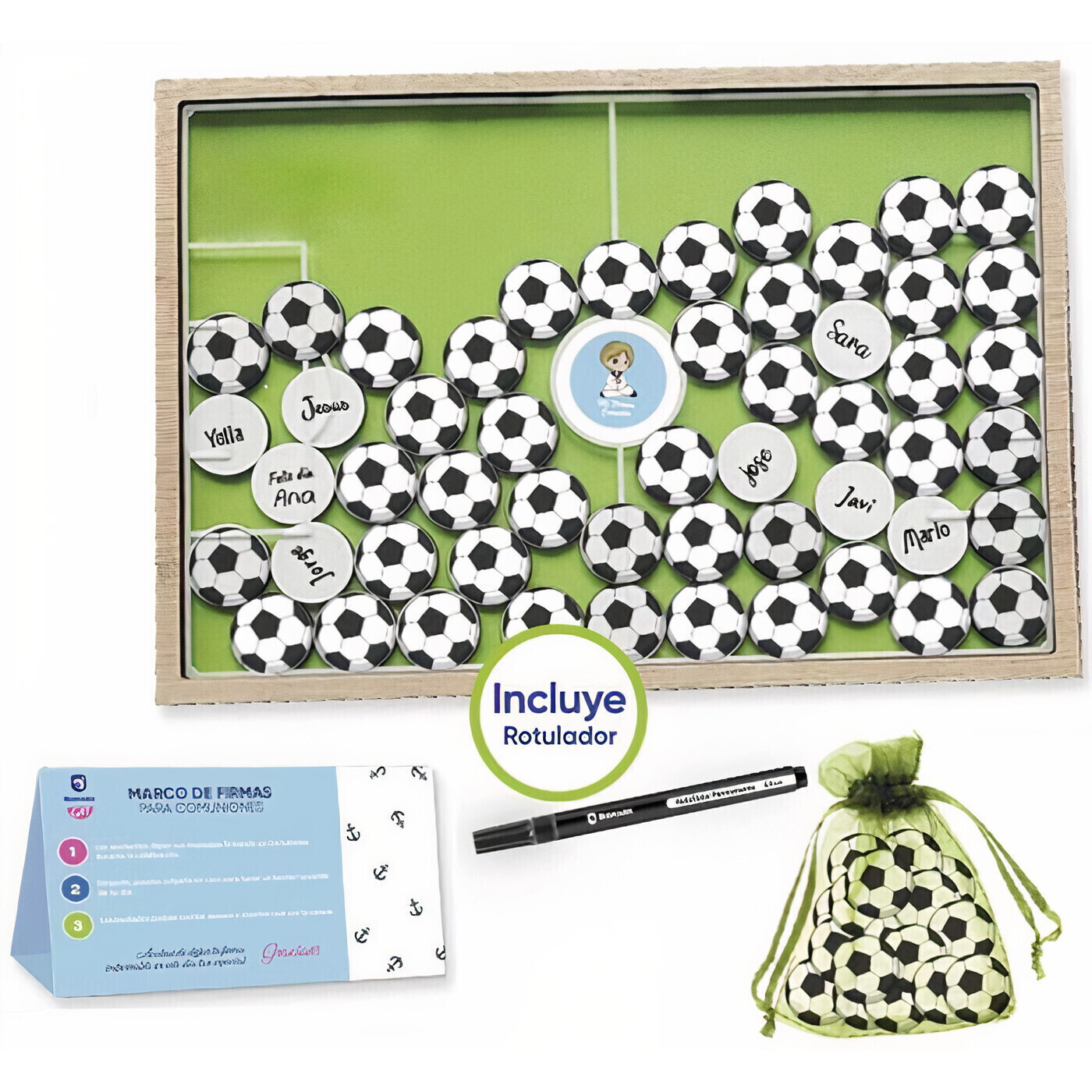 - Contiene circa 60 pezzi a forma di pallone, su cui scrivere una dedica o il nome sul retro.