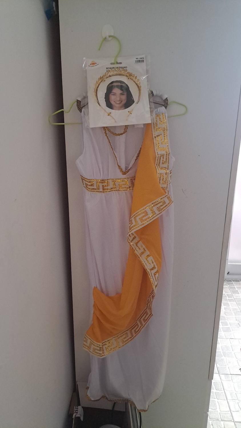 Splendido vestito da imperatrice romana per le più piccole della casa, composto da un lungo vestito bianco, accompagnato da ricami dorati e una bellissima forma triangolare sul petto. Porta appeso dalla spalla un mantello giallo con ricami abbinati al vestito.