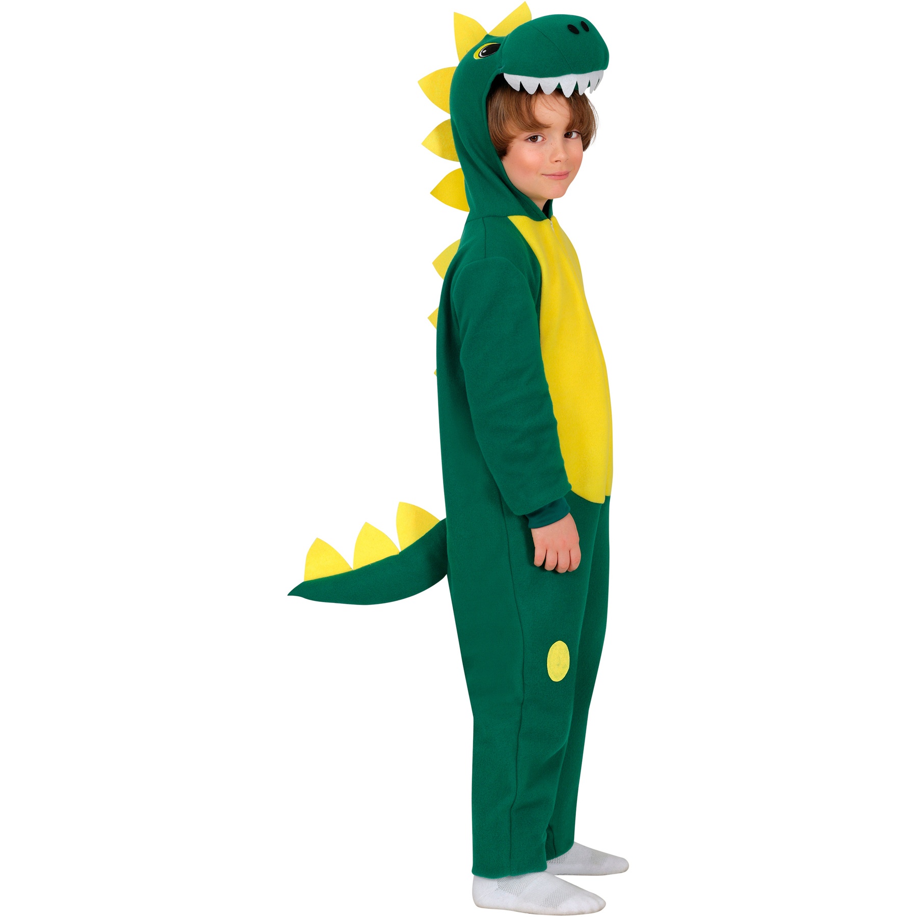 Trasformati in un divertente dinosauro con questo modello che combina i colori verde e giallo creando una combinazione perfetta.
