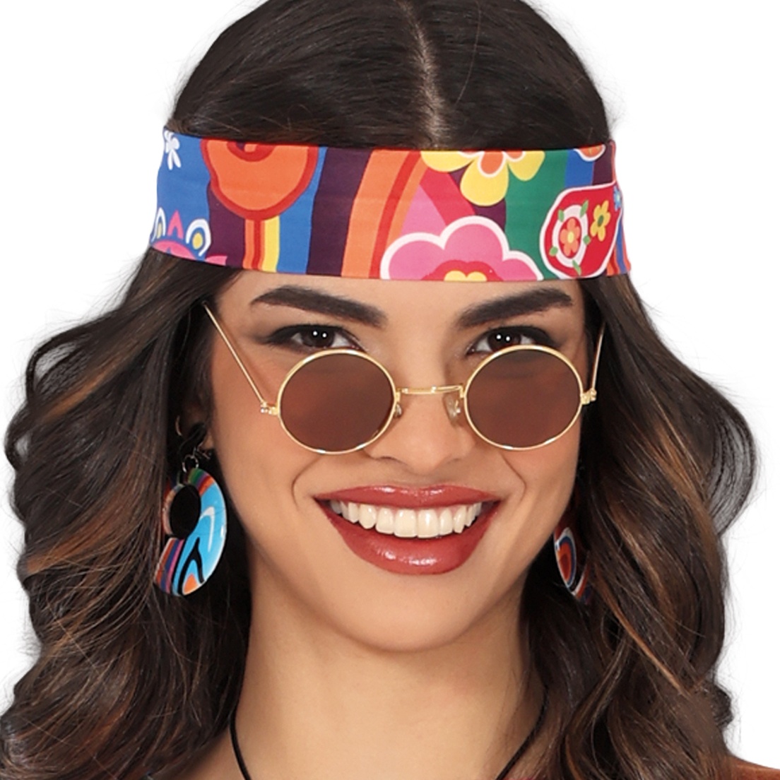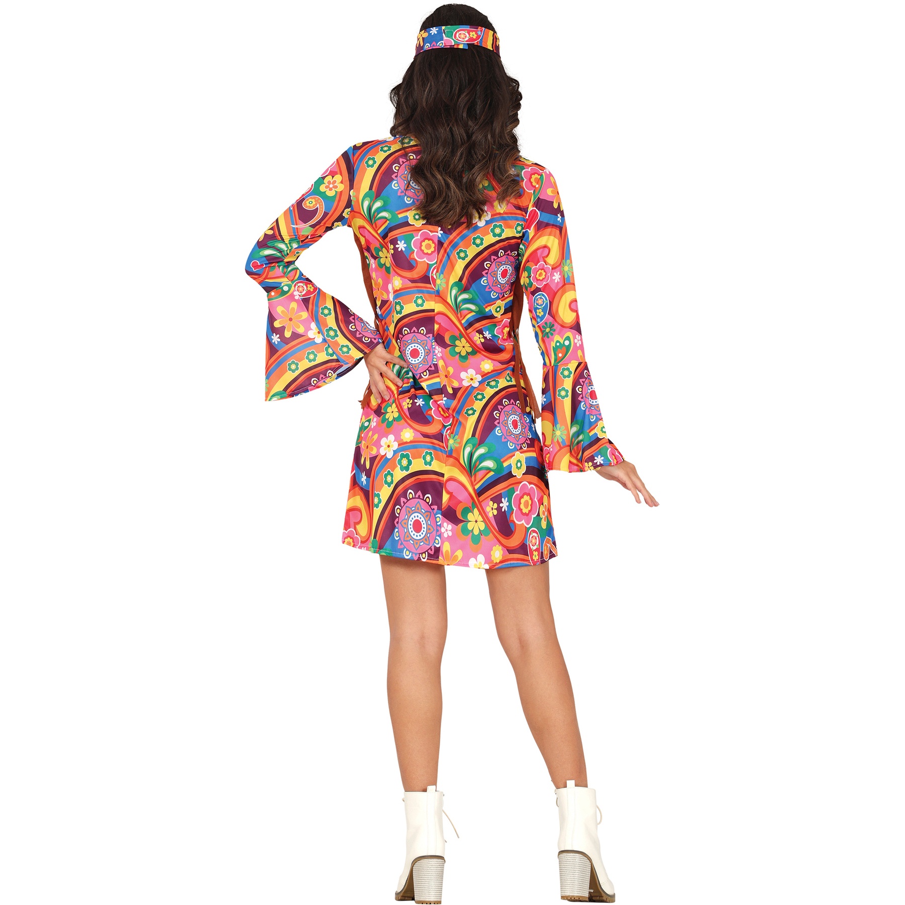 Colorato costume da hippie degli anni settanta per donna, perfetto per trionfare in carnevali, compleanni e feste a tema in generale. Pace e divertimento!