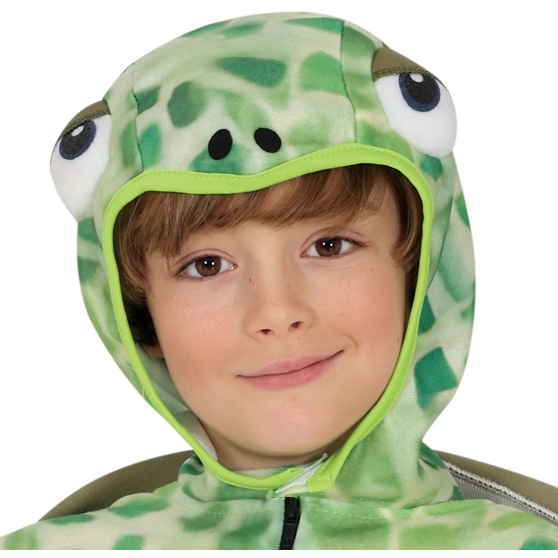 Splendido modello di costume da tartaruga per bambini che consiste in una tuta con un bel design stampato di foglie. Il cappuccio è attaccato alla tuta e questa è dotata di cerniera sul davanti.
