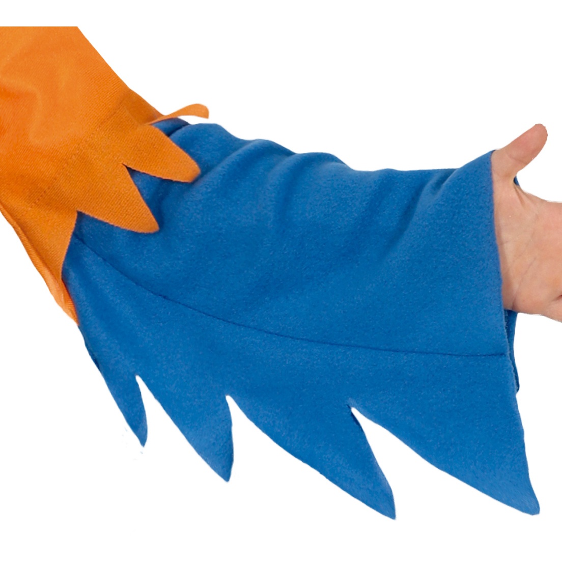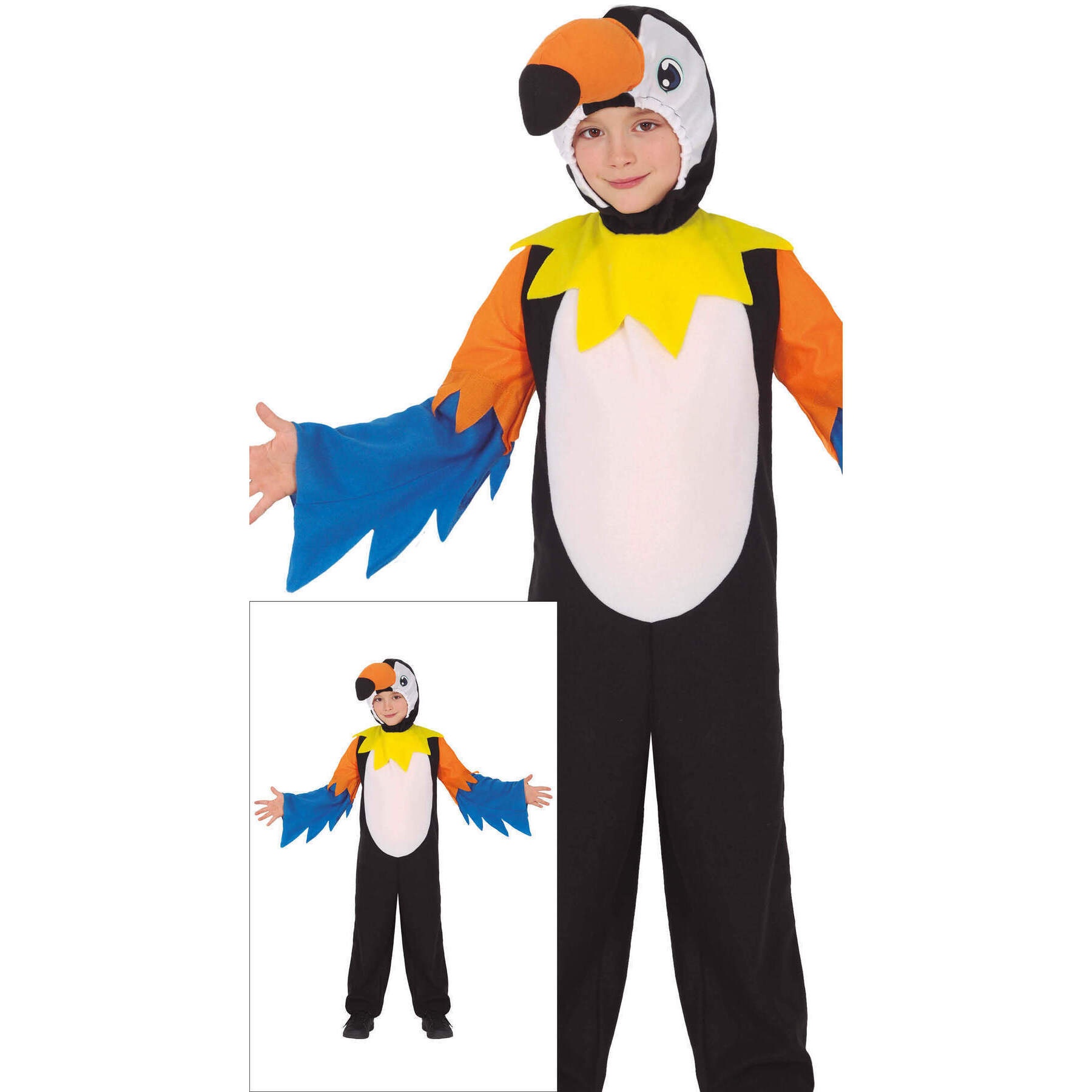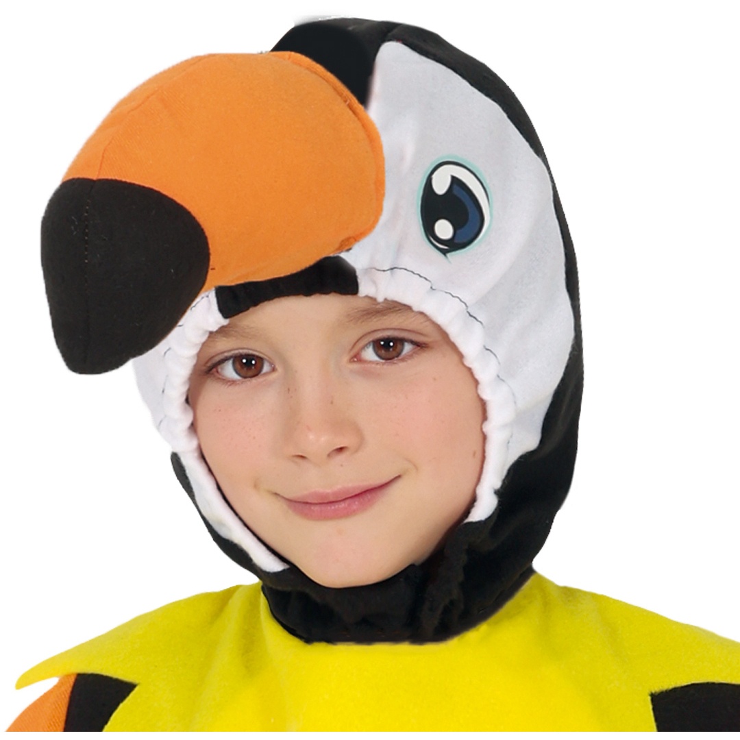 Colorato costume da tucano per bambini. Si tratta di una tuta con cappuccio con dettagli molto colorati sulle maniche.