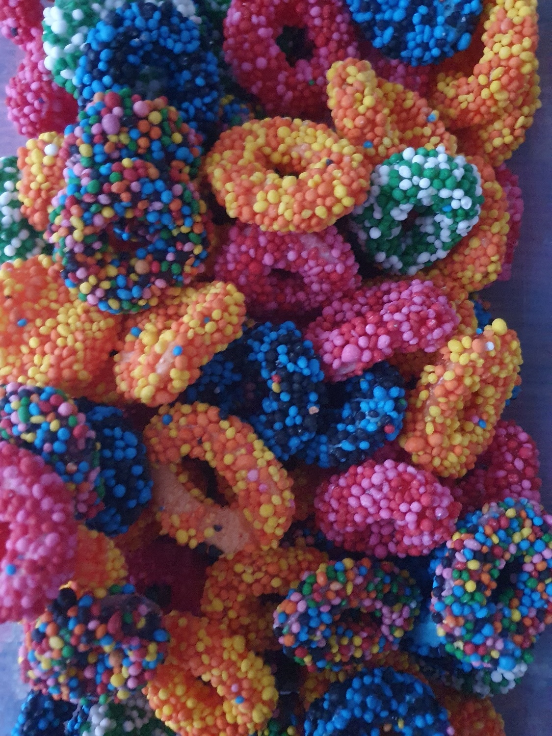 Ingredienti: zucchero, sciroppo di glucosio, acqua, farina di riso, gelatina bovina halal, acidificanti: E296, E330, stabilizzanti: E350ii, agente di rivestimento: E414, aromi, coloranti: E102, E122, E129, E133, E158. E102, E122 e E129 possono avere effetti negativi sull'attività e l'attenzione dei bambini.