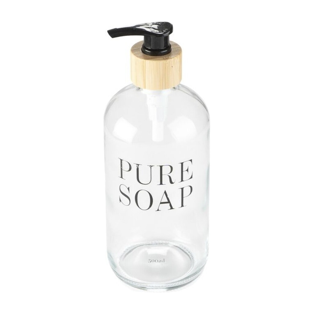 Bottiglia in vetro trasparente con serigrafia 'PURE SOAP' e tappo con finitura effetto bambù per uno stile caldo e contemporaneo.