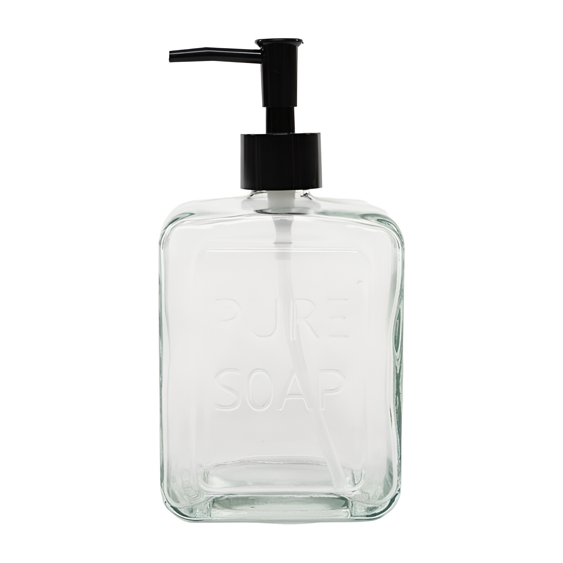 Elegante dispenser per sapone con rilievo "PURE SOAP" che conferisce un tocco senza tempo e decorativo al bagno.