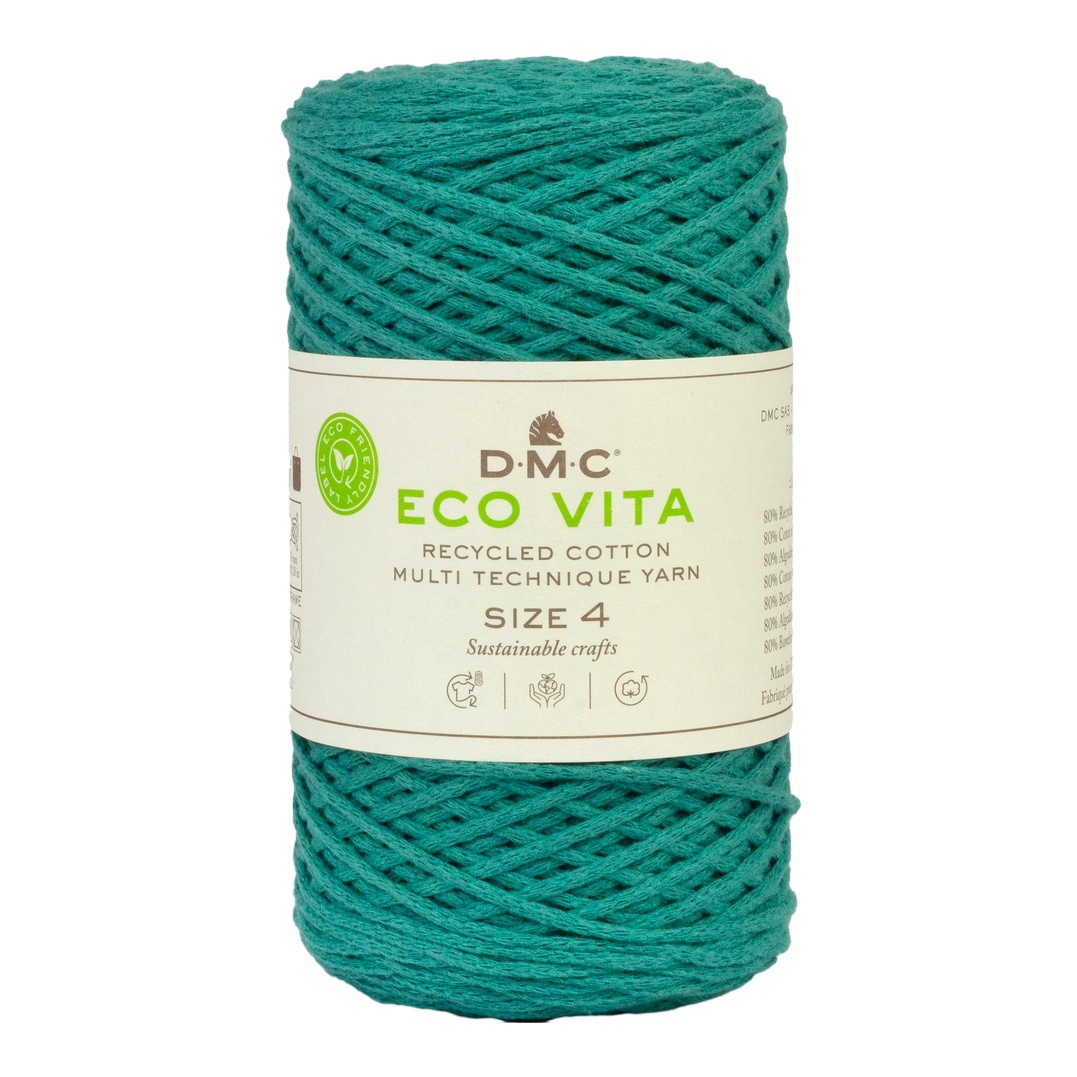 Realizzato con cotone riciclato, Eco Vita 4 è un filato spesso e tubolare perfetto per il macramè, il maglia o l'uncinetto in accessori per la casa, come cestini, vasi, cuscini e paralumi.