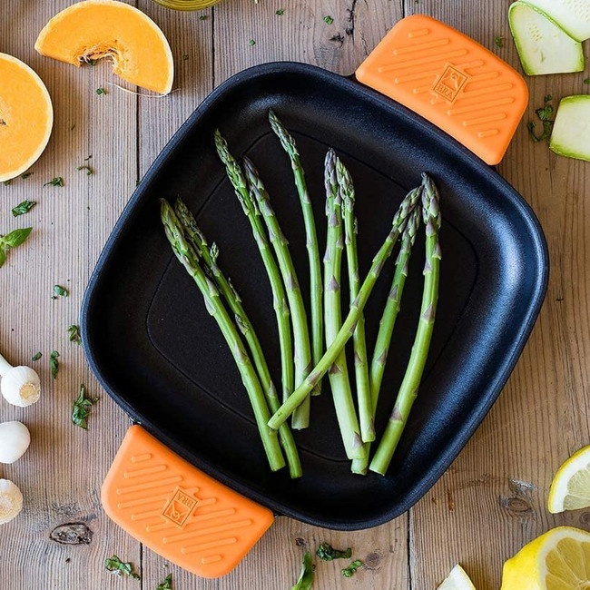 - Include due maniglie di silicone di colore arancione