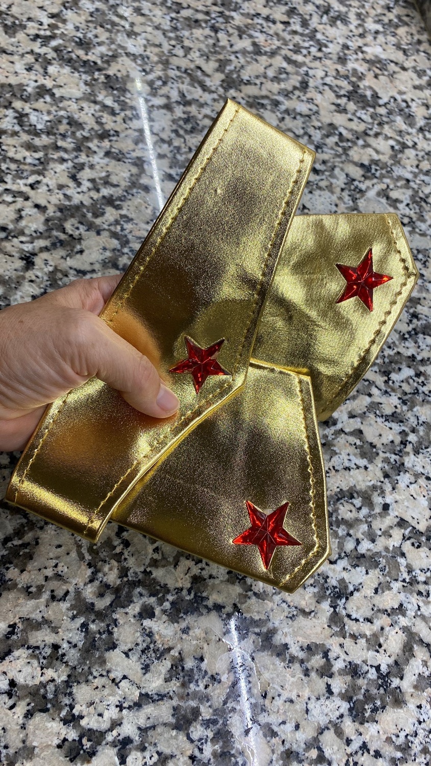 Questo prodotto è composto da una tiara di colore dorato, con elastici nella parte posteriore e una stella rossa nella parte frontale. I bracciali sono anch'essi dorati e presentano stelle rosse su entrambi i polsi, seguendo lo stile di Wonder Woman.