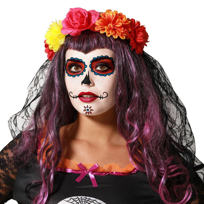 Fascia per capelli multicolore con fiori e velo da Catrina