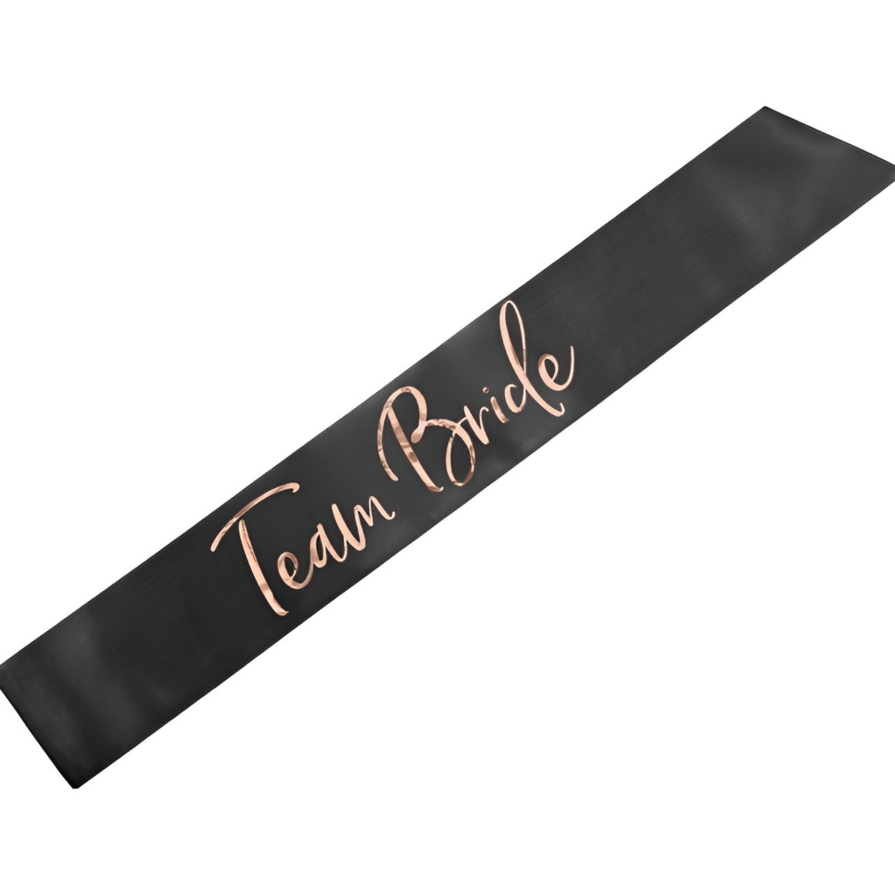 Team Bride in raso nero con elegante stampa oro rosa che dona un tocco sofisticato e festoso. Misura circa 75 cm di lunghezza e 10 cm di larghezza, con finitura lucida e un carattere stilizzato che risalta in foto e celebrazioni.