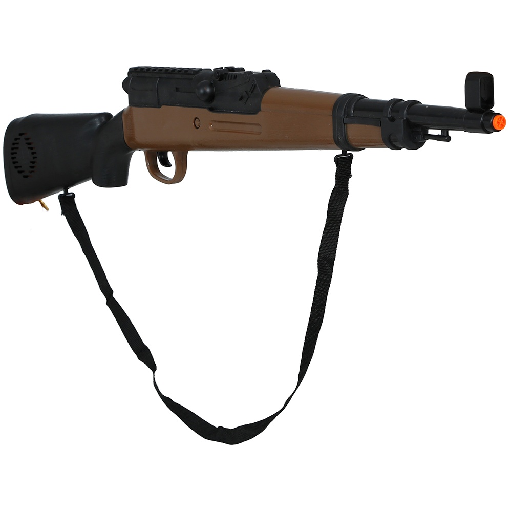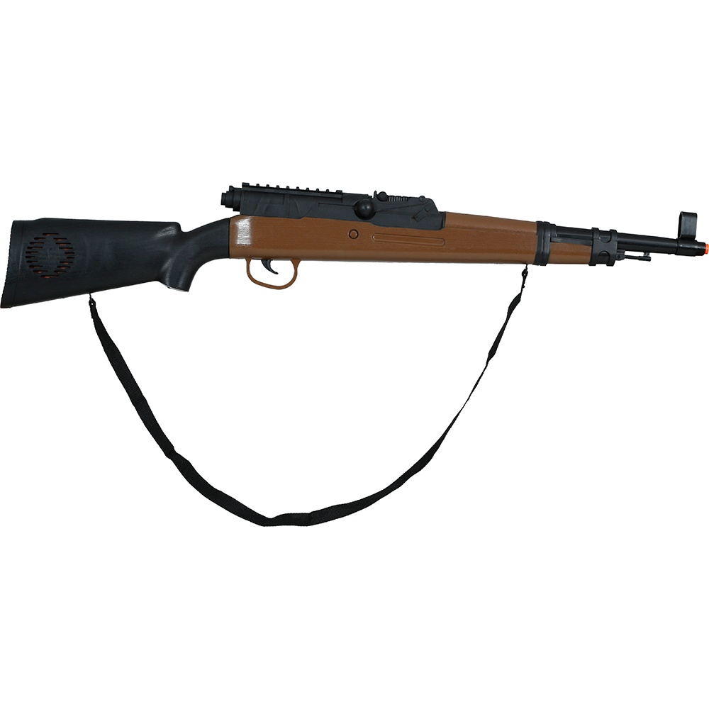 Replica di fucile ispirata ai modelli della Seconda Guerra Mondiale, perfetta per completare costumi e scenografie. Misura circa 70 cm e presenta una finitura che imita il legno e gli elementi metallici, con la punta di sicurezza arancione ben visibile. Realizzato in PVC leggero per un utilizzo pratico durante eventi e sessioni fotografiche, è dotato di cinghia di trasporto integrata per maggiore comfort e realismo. Ideale per Carnevale, teatro, rievocazioni storiche e photocall.
