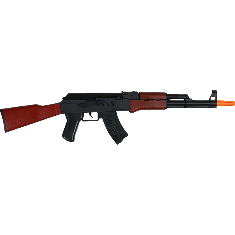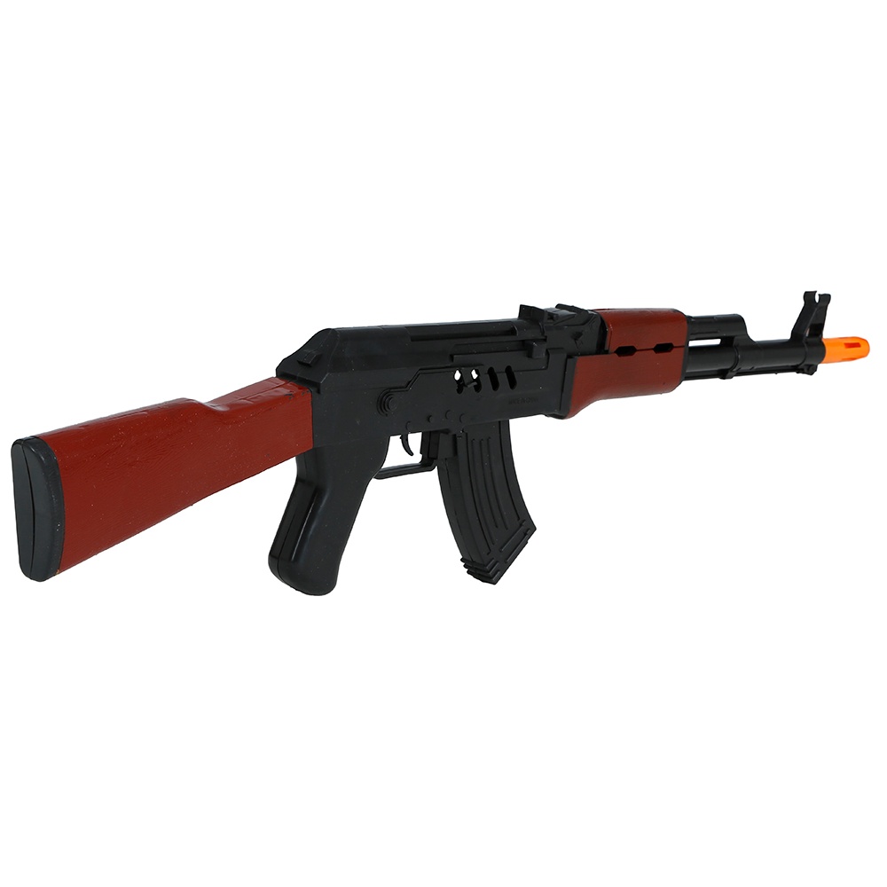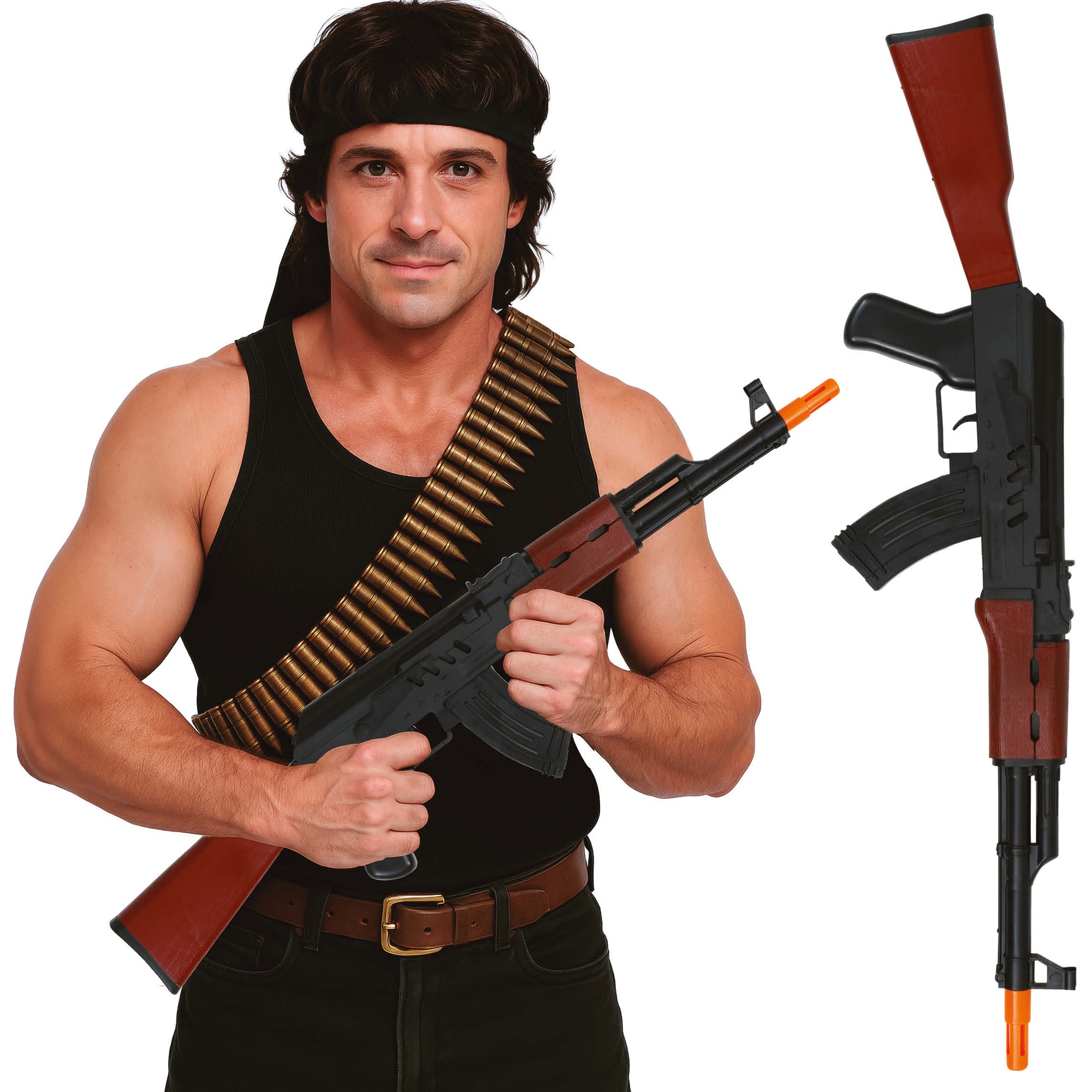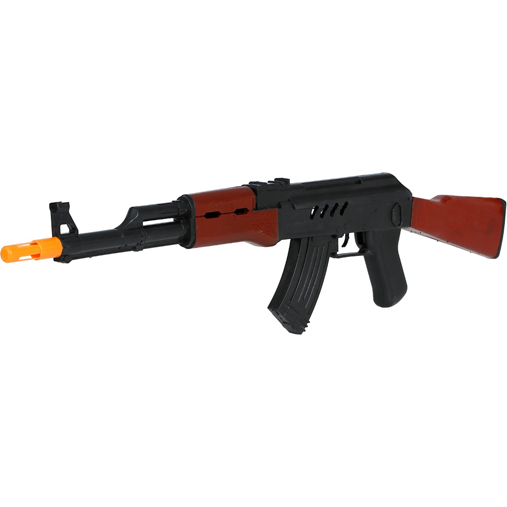 Replica di fucile dall'aspetto realistico pensata come accessorio per costumi. Il design riproduce un classico fucile russo con finiture effetto legno e punta di sicurezza arancione. Perfetto per completare look militari o da mercenario e per servizi fotografici ed eventi a tema. Leggero e maneggevole, offre grande impatto visivo senza essere un'arma reale.