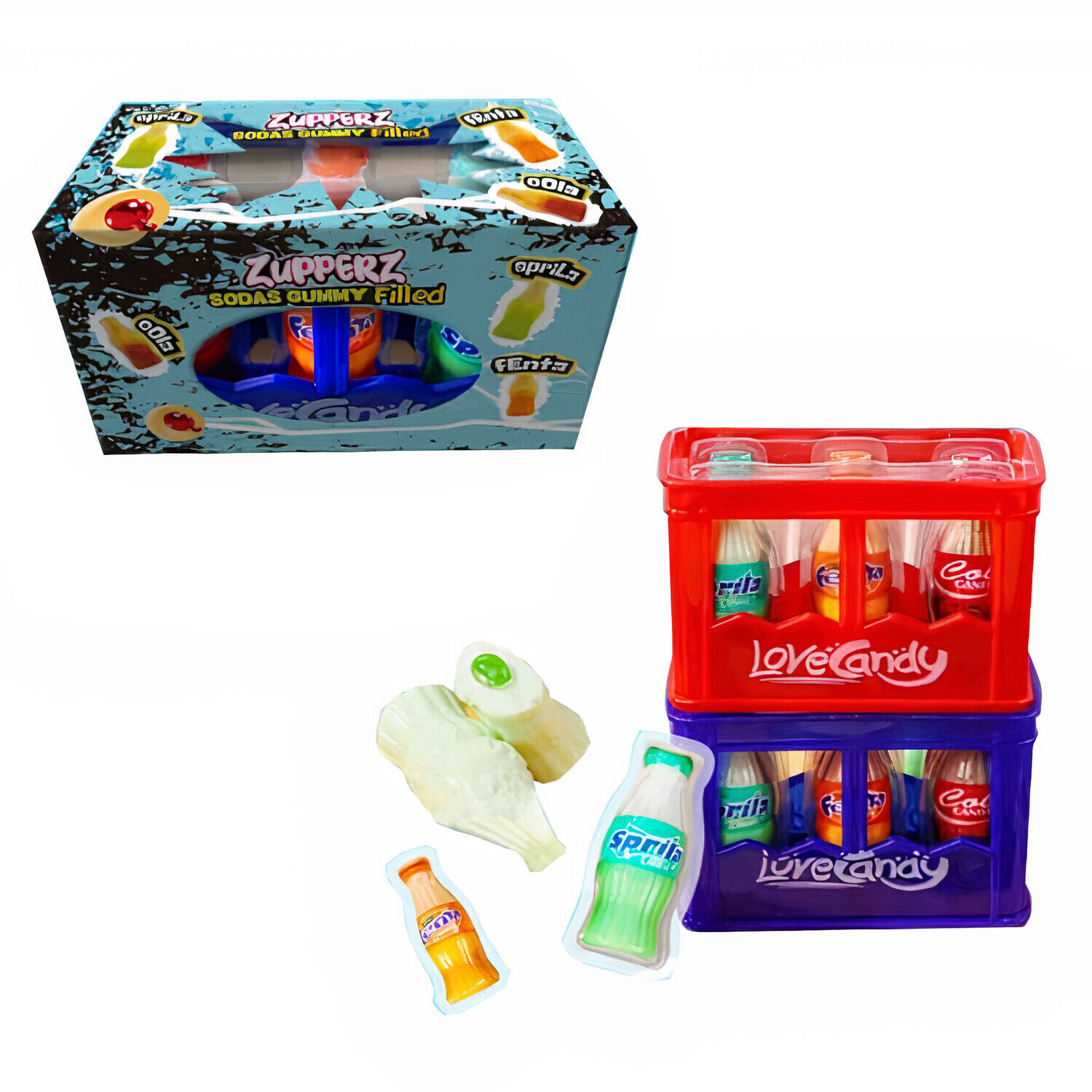 Ingredienti: Sciroppo di glucosio, zucchero semolato, acqua, gelatina, sorbitolo, succo concentrato, acido citrico, acido DL-malico, agar, glicerina, citrato di sodio, sorbato di potassio, olio vegetale, cera di carnauba, aromi (E110, tartrazina E102, blu brillante E133, caramello E150d).
