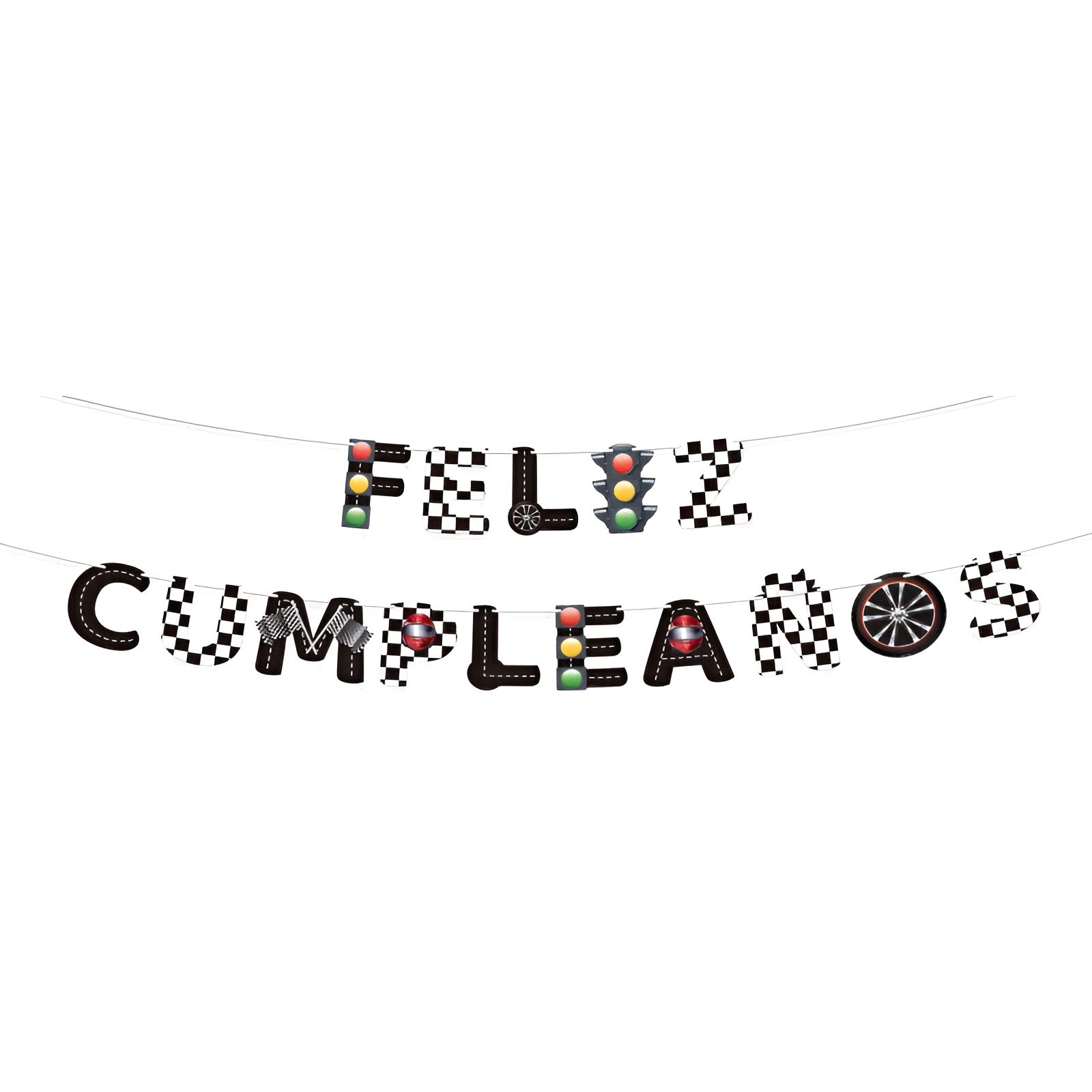 Unisce lettere vistose a motivi di auto, ruote e segnali stradali per creare un'atmosfera tematica e ricca di colore.