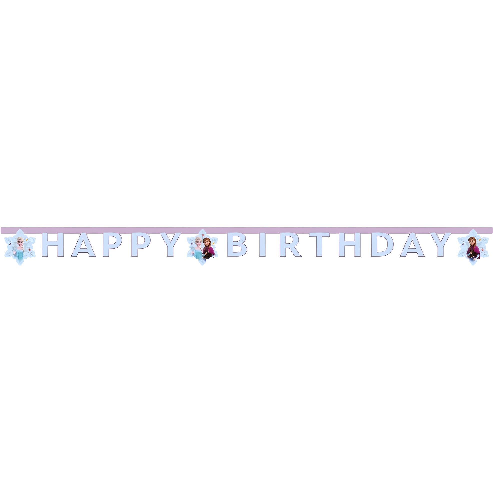 Ghirlanda a tema Frozen con le lettere "HAPPY BIRTHDAY" e figure di Elsa e Anna, perfetta per creare l'atmosfera a un compleanno per bambini.