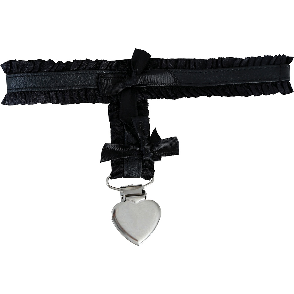 Elegante giarrettiera nera regolabile, pensata per la donna che cerca un tocco romantico: volant e fiocco decorativo donano fascino, mentre la clip metallica con pendente a cuore aggiunge un dettaglio femminile e luminoso. Comoda e adattabile, garantisce una tenuta sicura senza compromettere lo stile. Realizzata in poliestere con rifiniture metalliche per un look sofisticato.