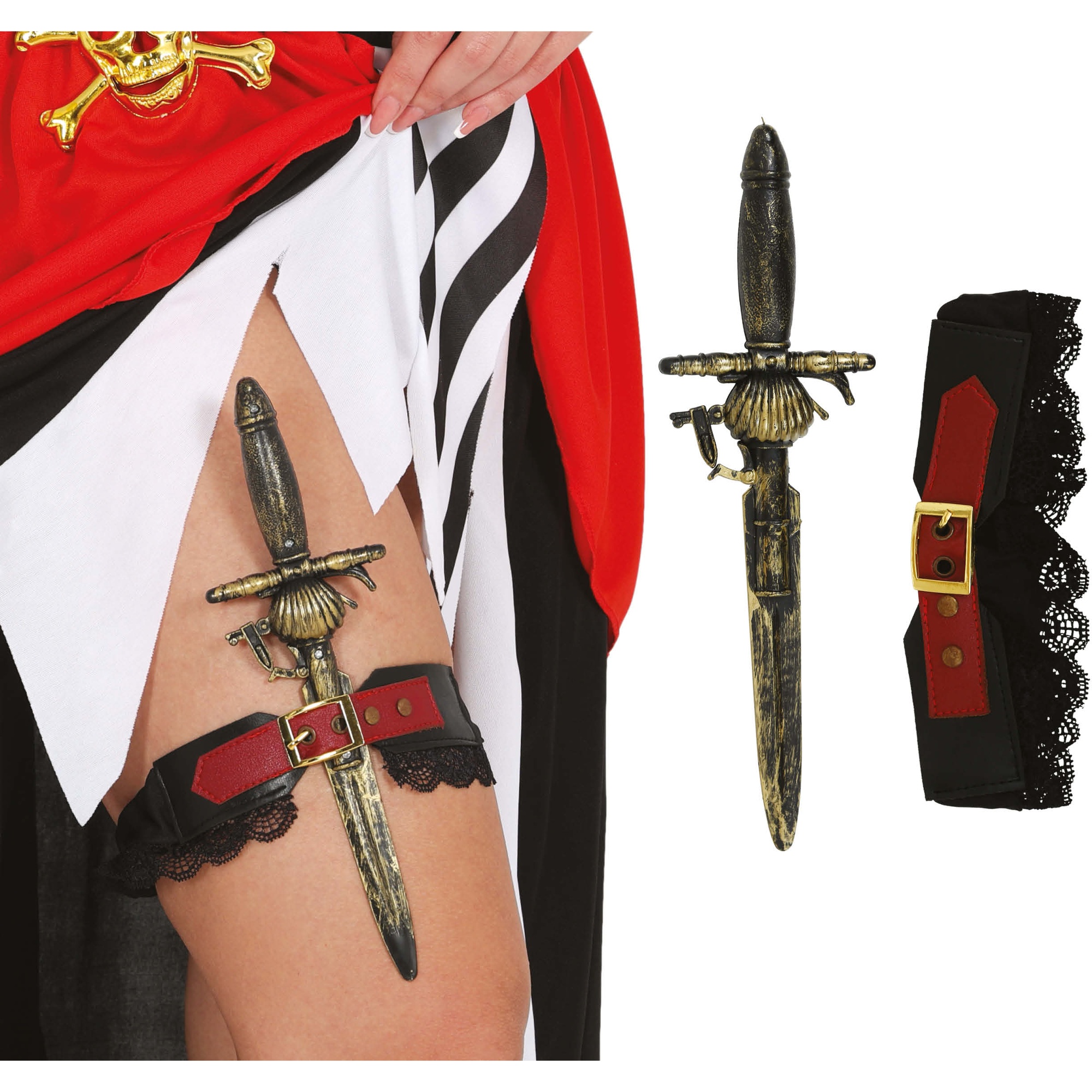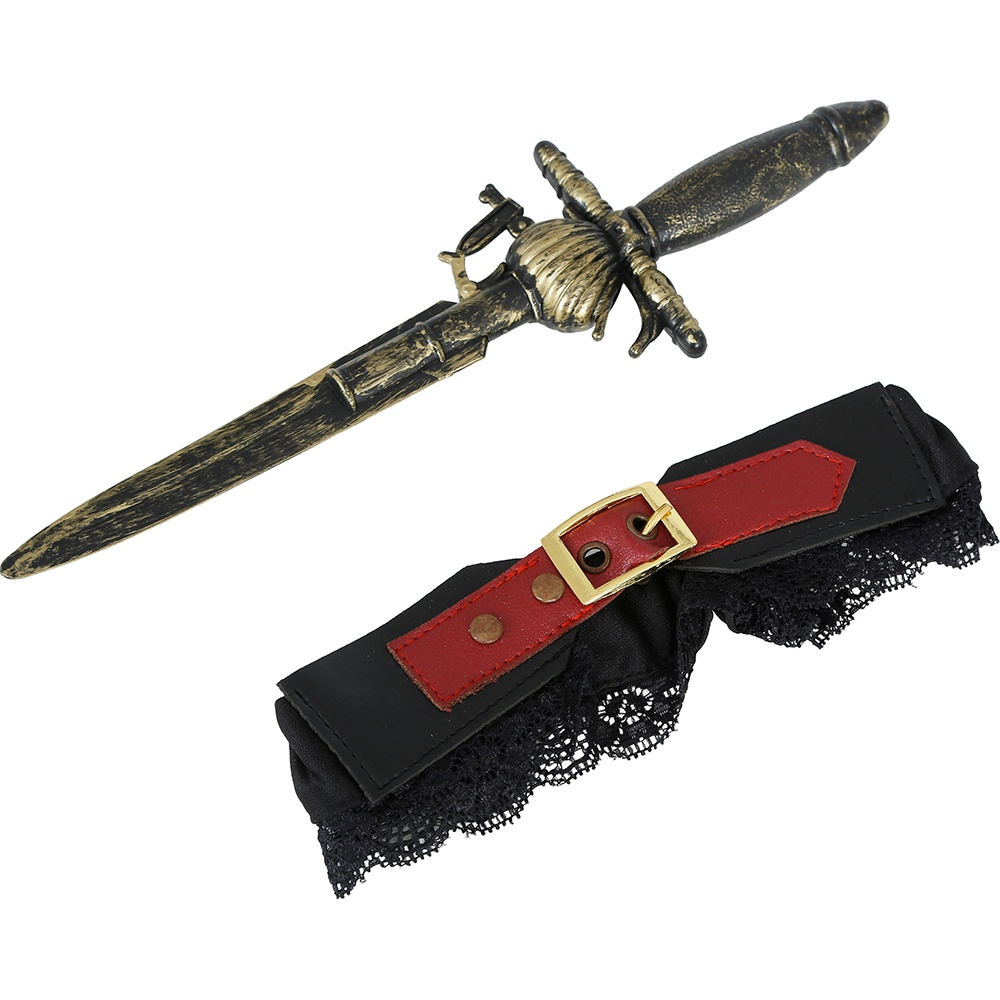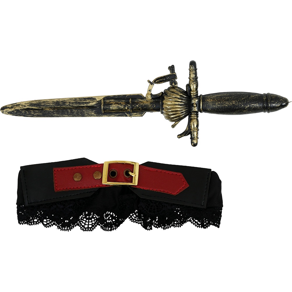 Glamour: giarrettiera con pugnale in stile pirata pensata per adulti. Dona un tocco tematico e audace al tuo costume da corsara o da marinara. Il pugnale decorativo con finitura antichizzata, unito alla giarrettiera in pizzo con fibbia, crea un accessorio appariscente e credibile. Design leggero e regolabile, si posiziona facilmente sulla coscia per completare il tuo look per feste, Carnevale o servizi fotografici.