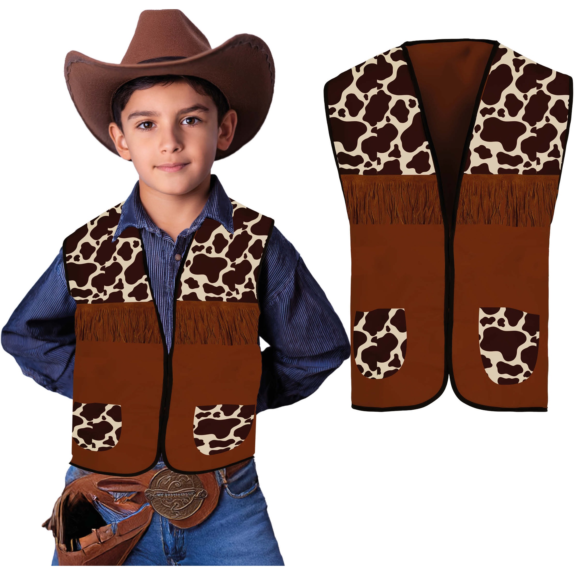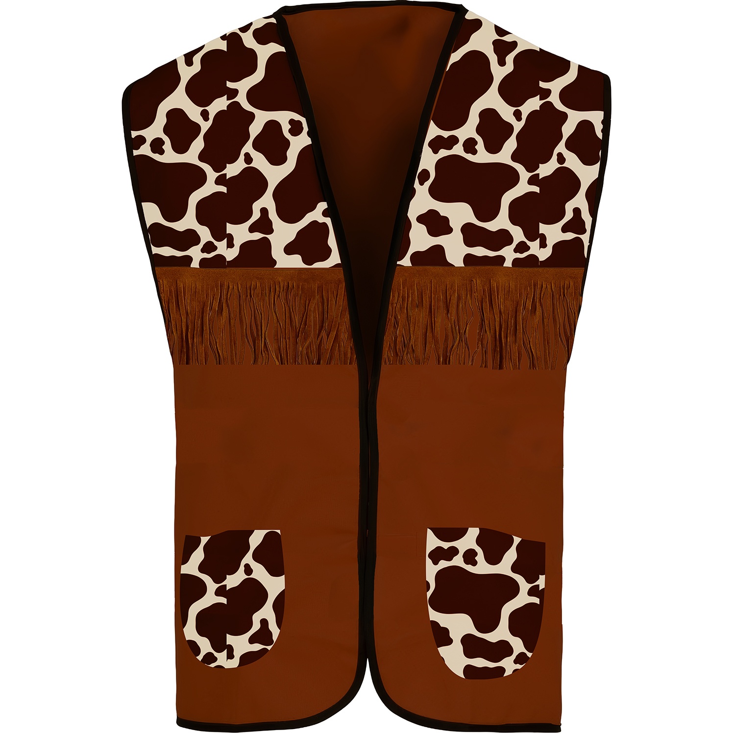 Gilet cowboy per bambini con stampa effetto mucca e frange decorative che dona un tocco divertente e autentico al look da cowboy.